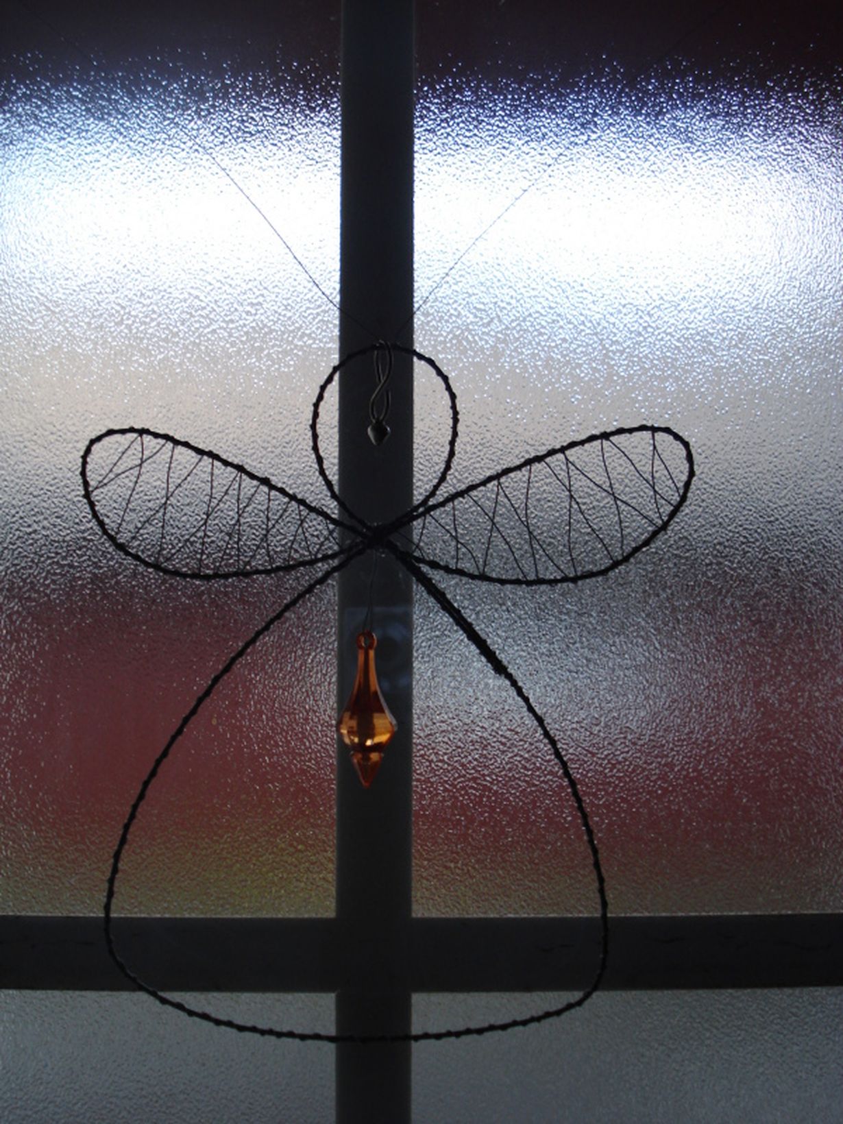Pojan poika oli joulumyyjäisissä ja saanut vanhemmilta rahaa jotain sielta ostamiseen. Tällaisen rautalangasta väännetyn enkelin oli hän halunut ostaa minulle mummilleen. Se on ollut ulkoovessa siitä lähtien.