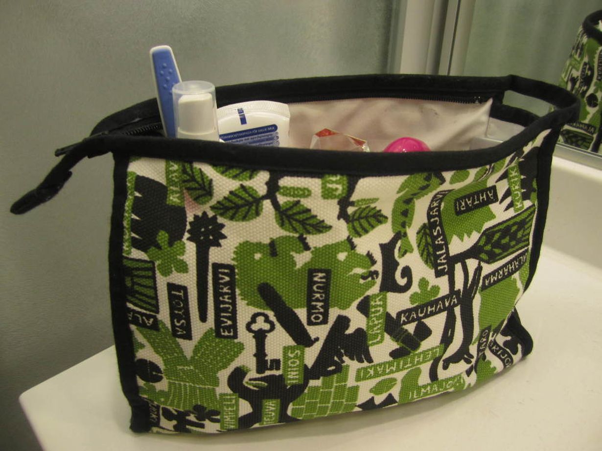 Koto-sarjan meikkipussin kuosissa on kaikki ent. Etelä-Pohjanmaan kuntien nimet ja vaakunat iloisesti pirin pärin. Sen lisäksi, että pussukassa kulkee mukana mukavassa kuosissa kotomaakuntani, niin se on kätevä säilytyspussukka tarpeellisille ehostustuotteille.