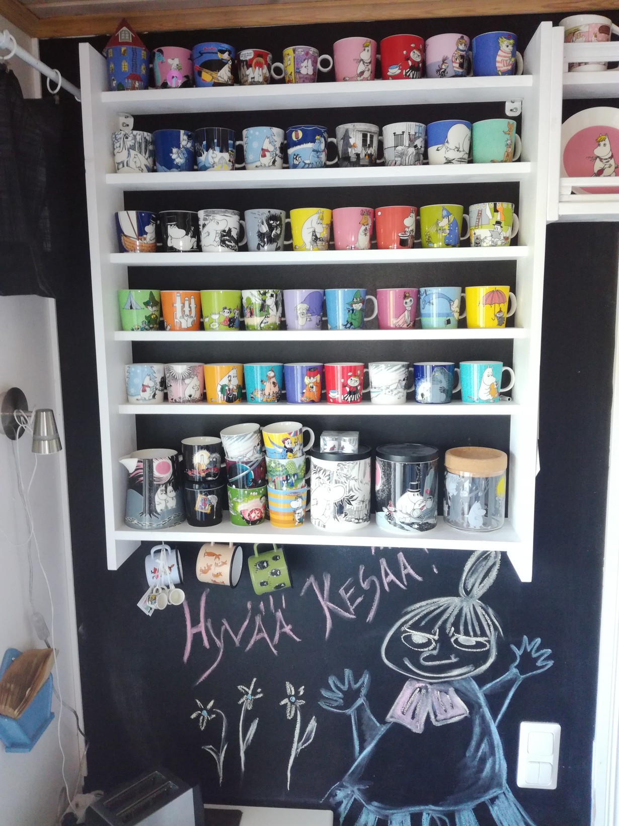 Hyllykkö on mieheni tekemä, juuri sellainen kuin toivoinkin. Hyllyä on jatkettu jo oven päälle, keräilyharrastuksen jatkuessa. Perinteisten muumimukien lisäksi muutama purnukka, emalimuki sekä hieman huutokaupasta hankittua "kiinanmuumia" & posliinikauhaa koristavat hyllyjä.