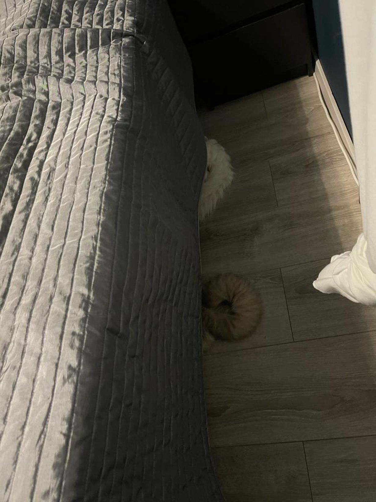 Oma koiramme Hilma 10v ja tytön koira Mila 5kk olivat illalla kateissa kun huutelimme niitä nukkumaan. Edes hännät eivät heiluneet kun löysimme ne vierashuoneesta.