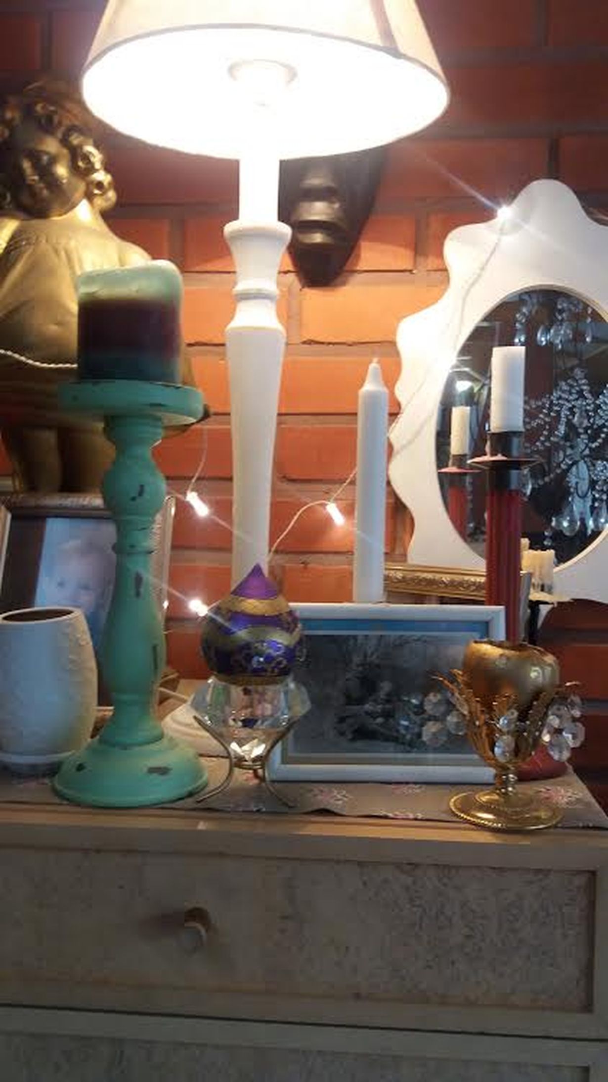 Valokuvakehystemme ympärillä on usein kynttilöitä, tosin ei aina näin paljon. Tässä tarkoituksella huonosti näkyvässä kuvassa on pieni tyttö ja poika sodasta tulleen isänsä kanssa. Pienokaisten äiti on kuollut.