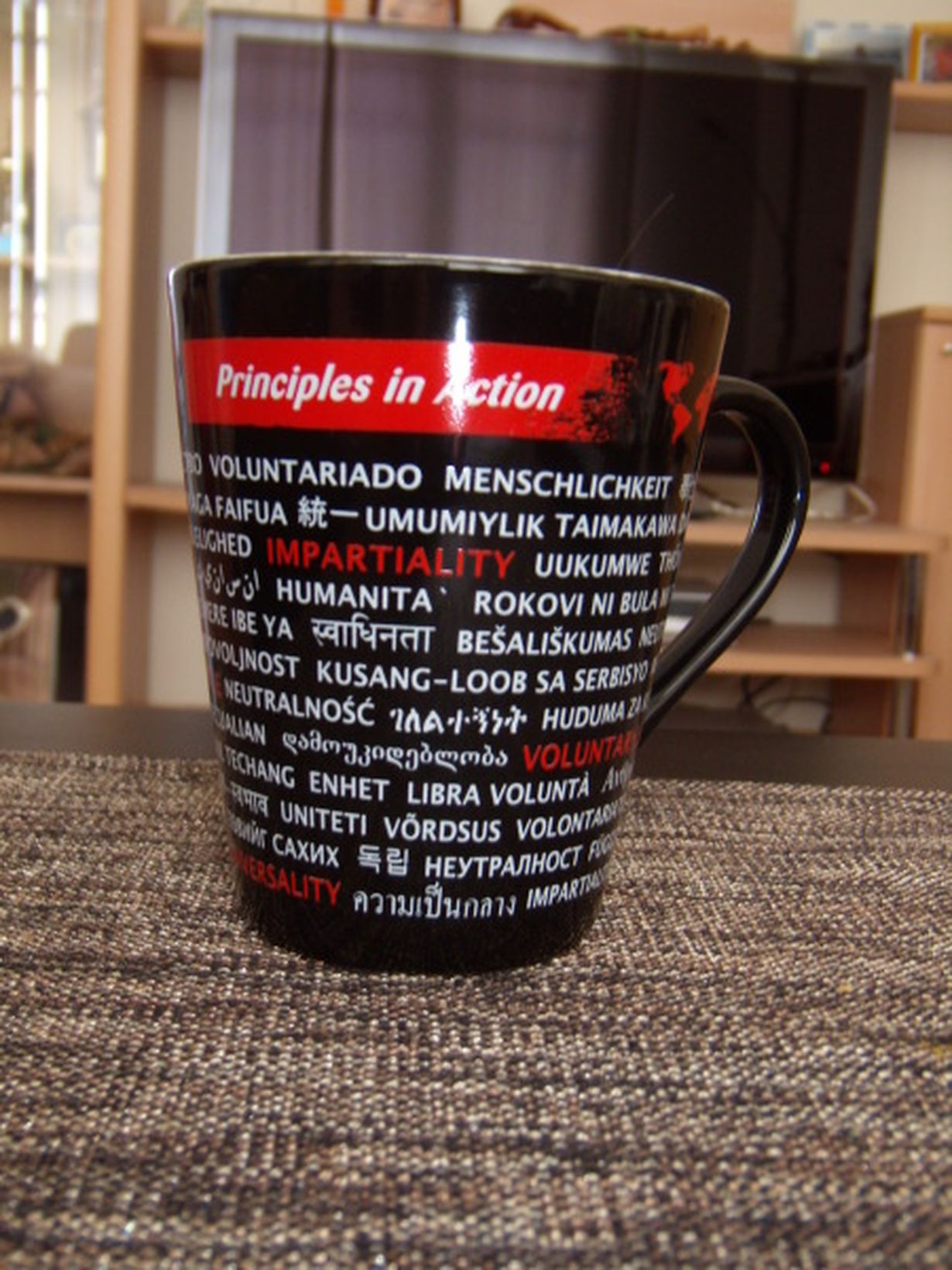 Olen ollut 10 vuotta Punaisen Ristin jäsen, viime vuodet aktiivisellainen. Järjestön toiminnasta on tullut elämäntapa, toiminnasta löytyvät rakkaat ystävät. Tämän kahvikupin sain valkoisen parinsa kanssa muutama joulu takaperin hyvältä ystävältäni.