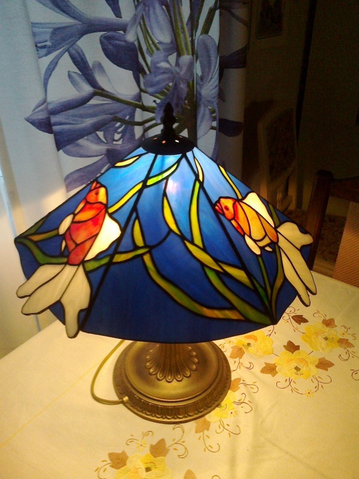Tein lampun miehelleni 60-vuotislahjaksi. Teko kesti liki 3 kuukautta, kun sitä piti tehdä salaa. Lampussa on lähes 200 palaa ja se on tehty Tiffany-tekniikalla.