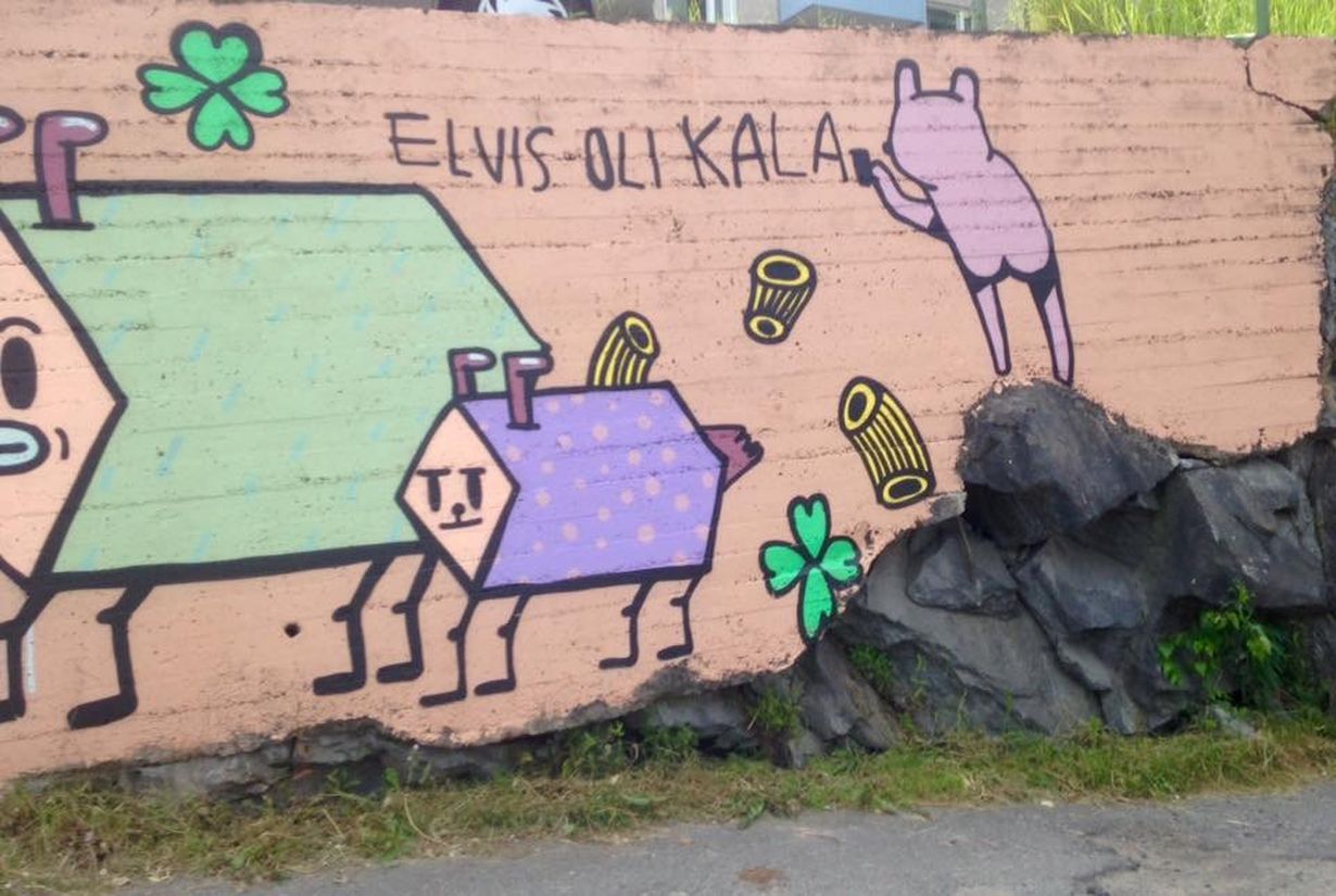 Savonlinnassa joskus -80-90-luvun taitteessa tuo teksti - Elvis oli kala, ilmestyi suurin tikkukirjaimin kirjoitettuna keskustassa sijainneen viljasiilon varastorakennuksen seinään. Vuosien ajan tuosta ohikulkiessa teksti aiheutti hilpeyttä ja samalla pohdiskelua, kuka tekstin takana olikaan. Vuosia myöhemmin siilo ja sen rakennukset purettiin ja tyhjälle tontille ilmestyi irrallinen kyltti, jossa samainen teksti komisti. Tuokin hävitettiin muutamassa päivässä. Nyt Elvis oli kala komistaa virallisesti Savonlinnan katutaidetta, suunnitellussa maalauksessa.