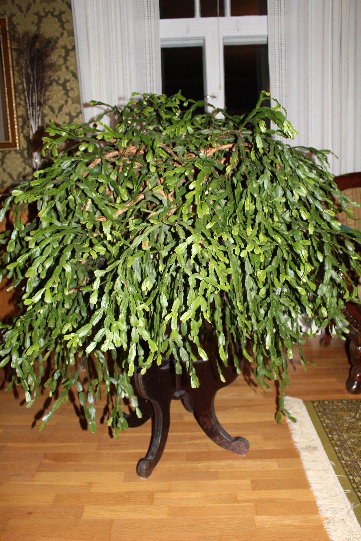 Joulukaktuksen sain äidiltäni, joka taas oli saanut sen omalta äidiltään – kukan iäksi arvioimme noin 40 vuotta. Äidilläni se oli vähän tielläkin eikä ko. huoneeseen paistanut aurinko kuin aamulla varhain. Toin sen vanhan maalaistalomme suureen saliin, jossa on 4 ikkunaa. Sielläkös se ryöpsähti kasvamaan oikein olan takaa! Joulukaktuksemme ympärysmitta on yli 4 metriä ja pisimmät oksat yltävät kohta jo lattialle. Kaksi kertaa vuodessa saamme nauttia hurmaavan punaisista kukista, joita sitten lakaisen lattialta muutaman viikon päästä roskapussillisen.