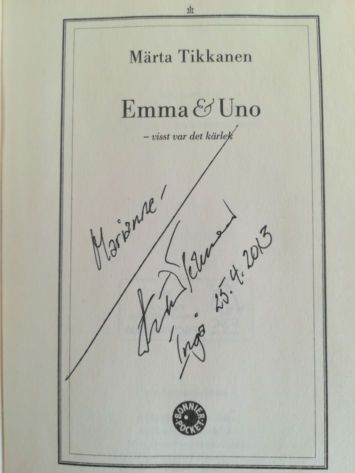Lähetä kuva julkkiksen nimmarista – voit voittaa Arabian Pastoraali-astioita! Emma & Uno Marianne 5.1.2020 klo 12:41 Märta Tikkasen omistuskirjoitus hänen uusimpaan kirjaansa Emma & Uno(2013).