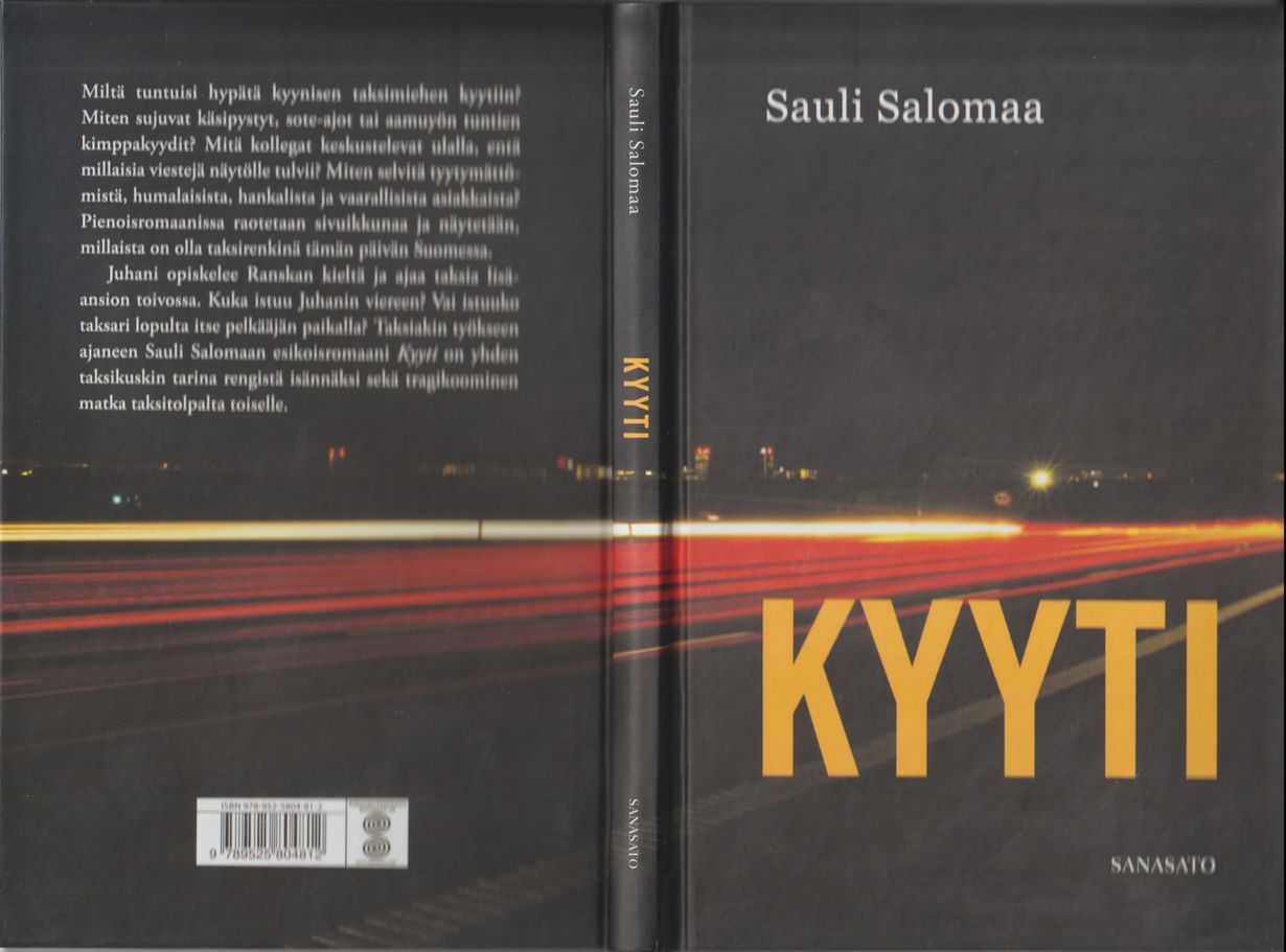 Avopuolisoni Sauli Salomaa julkaisi romaanin Kyyti (Sanasato) yhdeksän vuotta sitten. Teksti on niin mukaansa tempaavan tragikoomista ja kertoo houkuttelevasti ajasta juuri ennen taksiuudistusta.