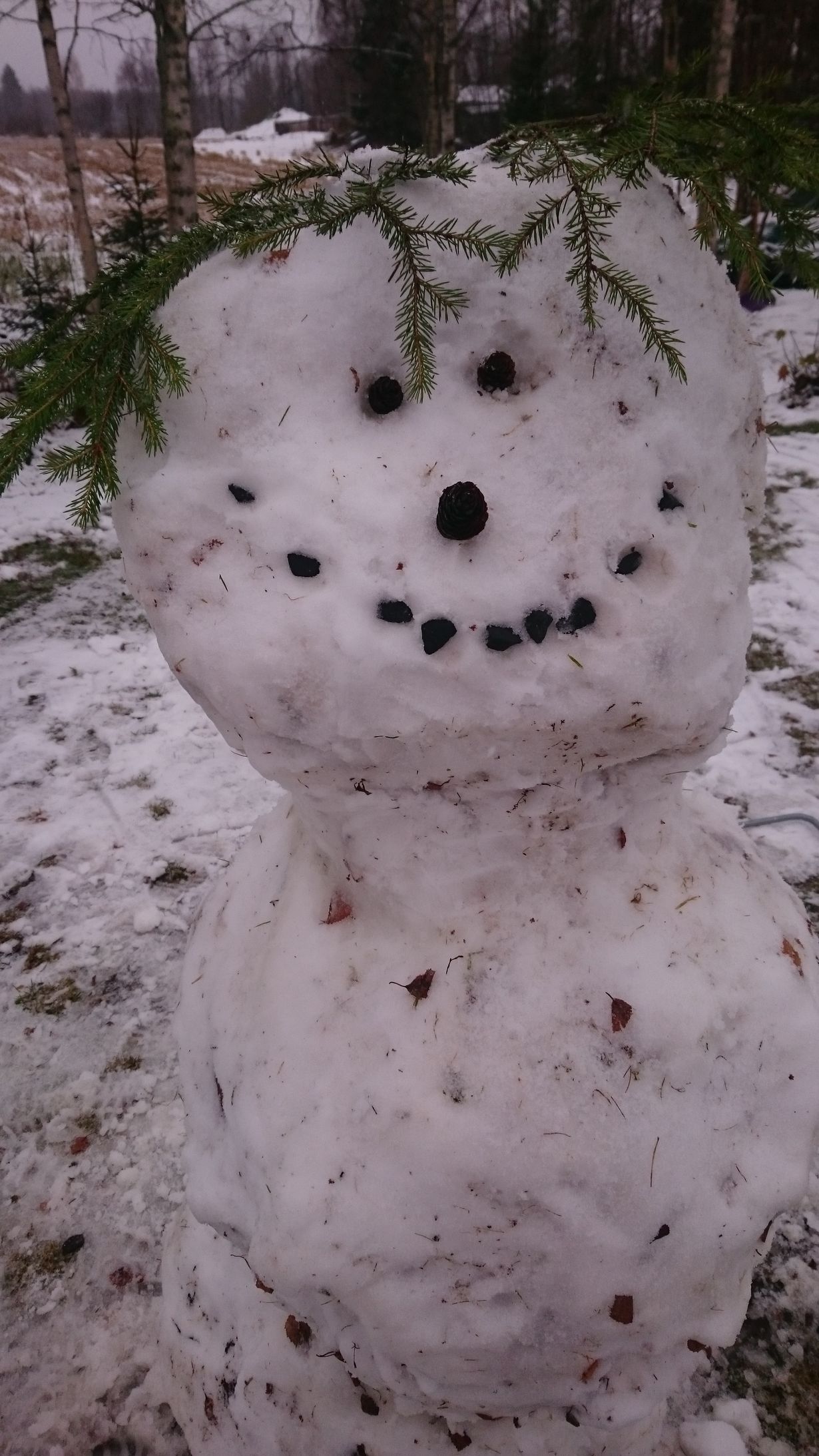 Tehtiin ensilumesta ukko tälle talvea. Lapset tilas ja äiti teki. Mummi tuli kylään ja tuumas, ettei ole koskaan ennen nähnyt lumiukolla luppakorvia. Eihän ne korvat olekaan, kuin hiukset ?