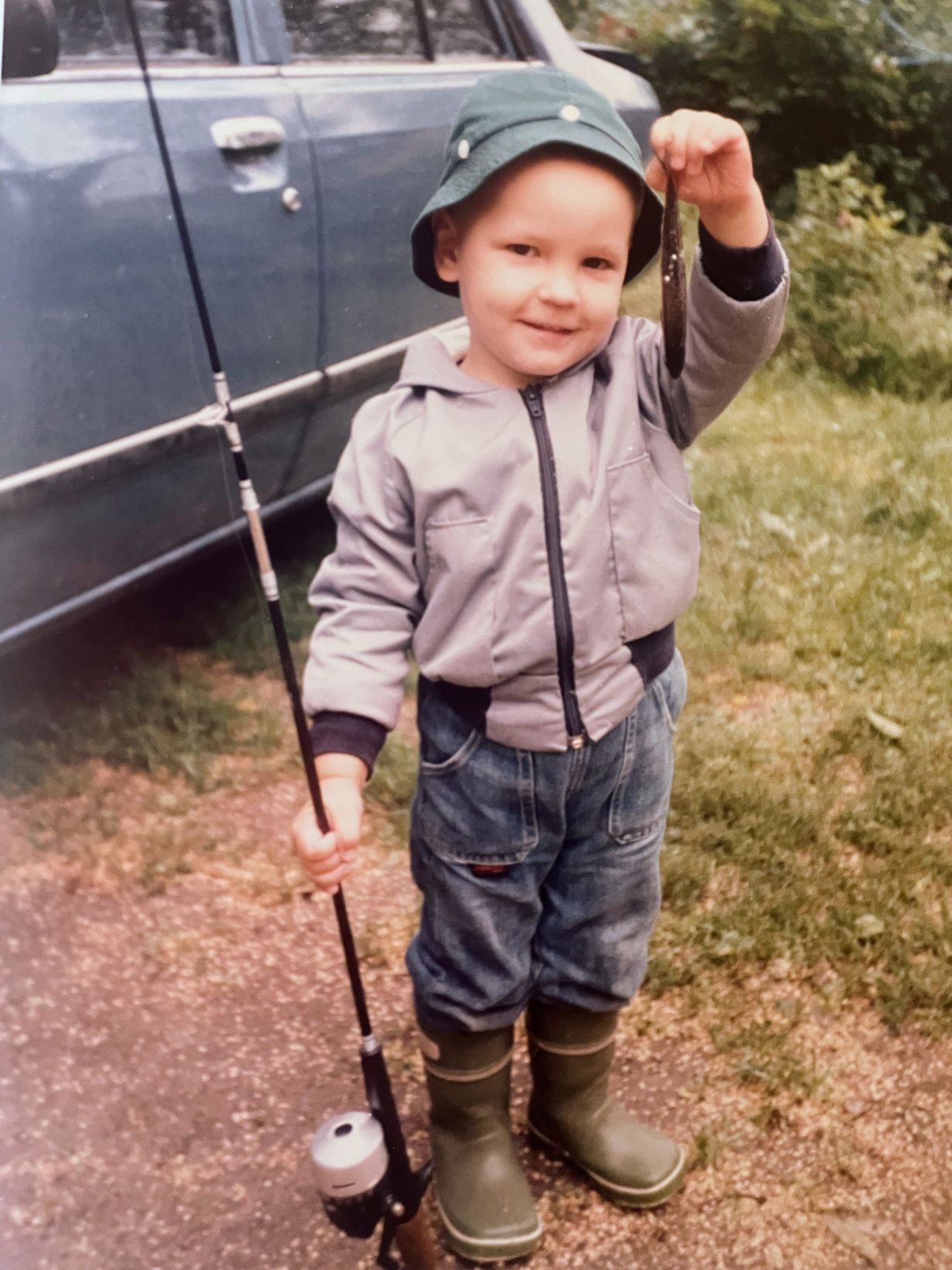 Innokkaan, iloisen ja saavutuksestaan ylpeän pikku-kalastajan ensimmäinen kalansaaliis.