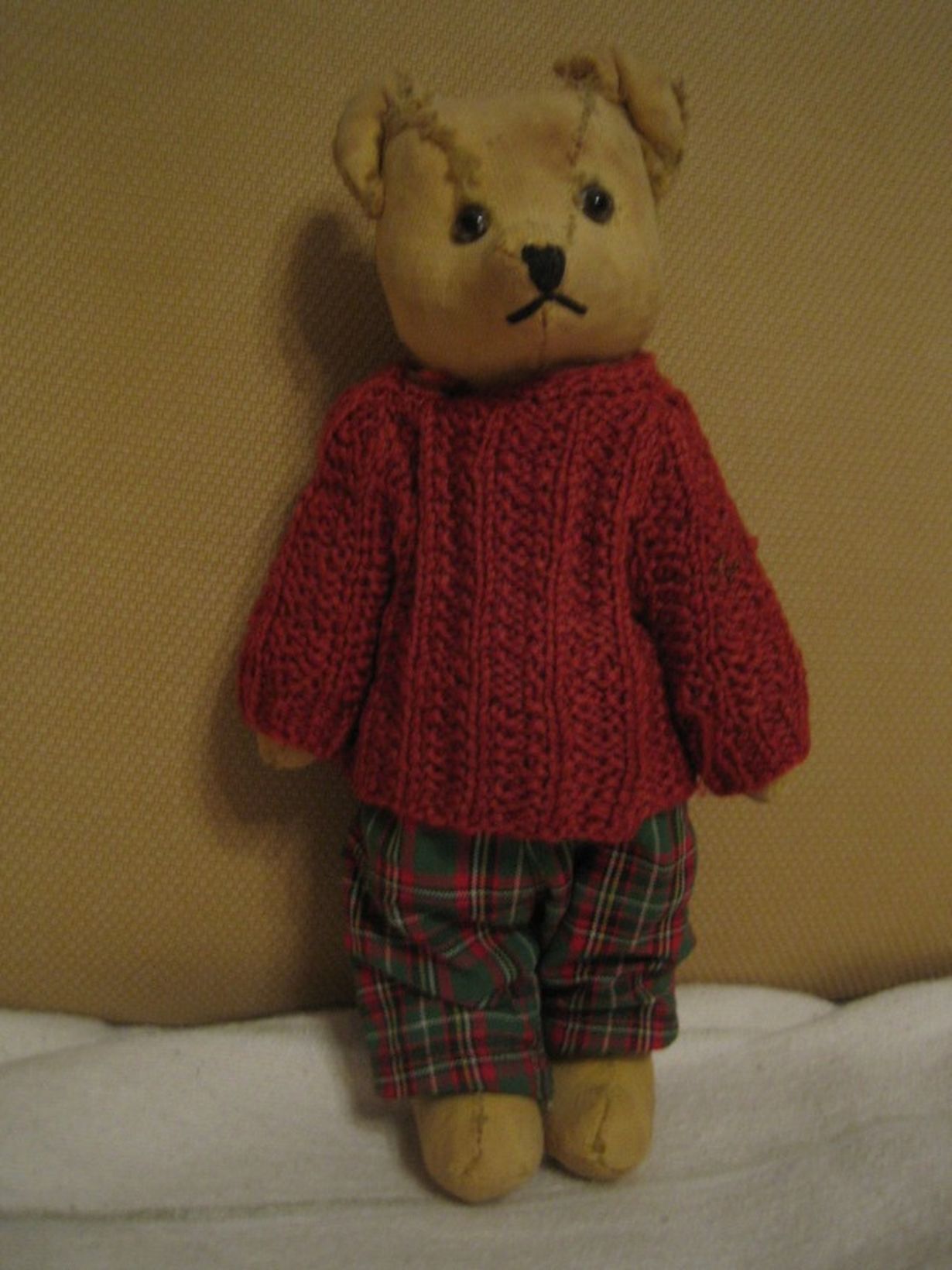 Ensimmäinen nalleni 60-luvun alusta. Jostain syystä olen nyppinyt siltä kaikki karvat pois. Niinpä isoäiti tai äiti on tehnyt nallelle villapaidan ja housut, ettei pientä paleltaisi.