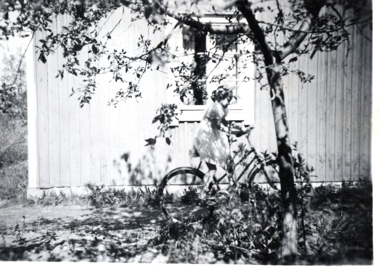 Olen elänyt lapsesta asti proteesijalan kanssa. Kesällä 1955 isäni löysi pienen minulle sopivan pyörän. Tässä piha-ajelu jo onnistuu.