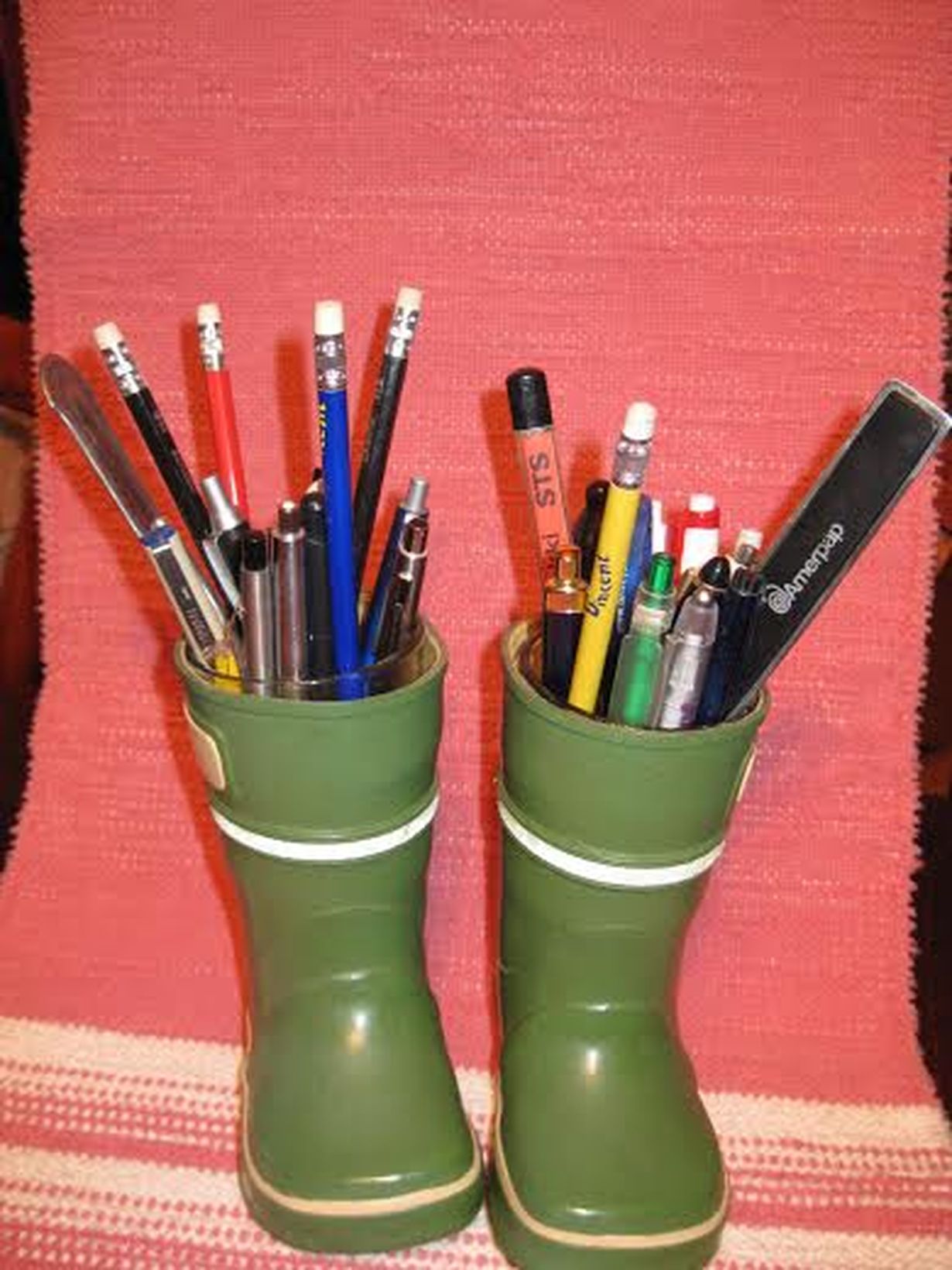 Tämä ihana arki: kynäteline Ensimmäiset kumisaappaat 20.1.2014 klo 8:50 Vanhempieni luona isäni tietokonepöydällä uusiokäytössä kynätelineenä ovat ensimmäiset kumisaappaani kokoa 20 70-luvulta. Katja