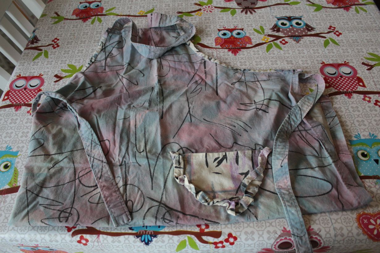 Esiliina kotitaloustunteja varten. En olisi millään halunnut tehdä rypytettyä taskua, kun se ei mielestäni sopinut yhtään essuun. Tämä oli kuitenkin pakollinen osa essua, ja se oli niin vaikeaa, että tasku ja rypistys on hieman kärsinyt sen purkukerroista.