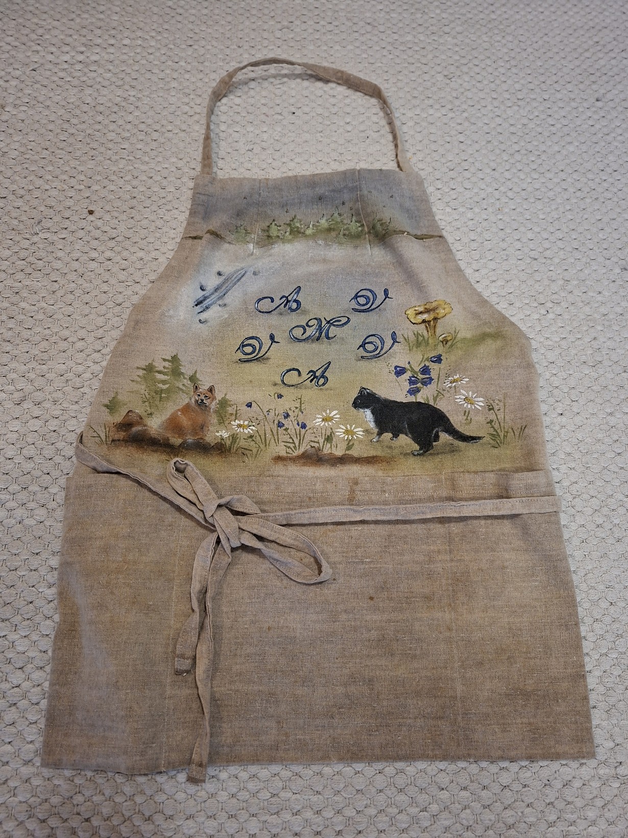 Sain ystäväni tekemän esiliinan 20 v sitten lahjaksi.Ystäväni on piirtänyt rakkaitteni etukirjaimet sekä elämäni tärkeiden asioiden kuvat esiliinaan. Joka kerta kun laitan tämän päälleni sydämessäni käy lämmin läikähdys.