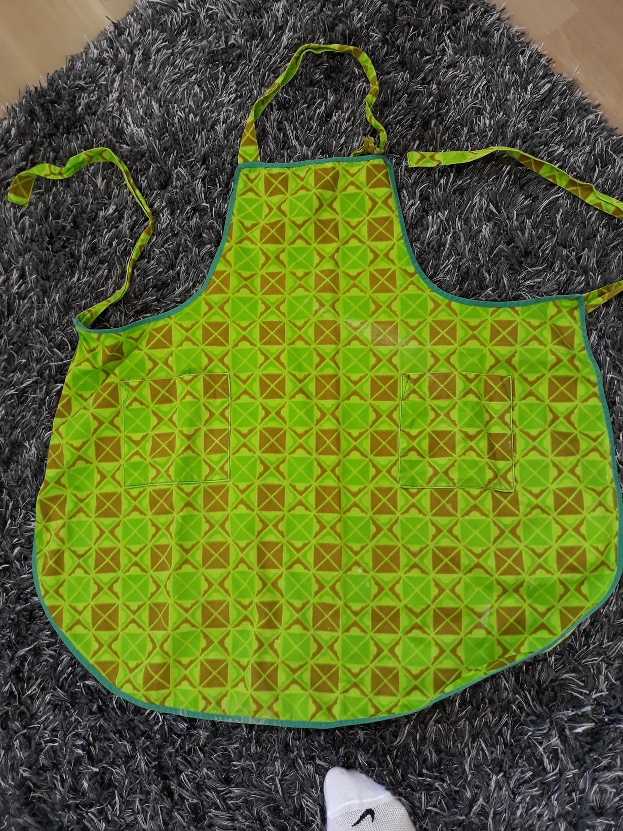 Kävin keskikoulua tyttölyseossa 60- luvulla. Ja ennen kuin kotitalous oppiaineena alkoi, teimme käsityötunneilla essut. Vinokaitale ommeltiin käsin, pienen pienillä pistoilla. Kangas on vahvaa, joten essu on vieläkin hyväkuntoinen ja käytössä joskus.