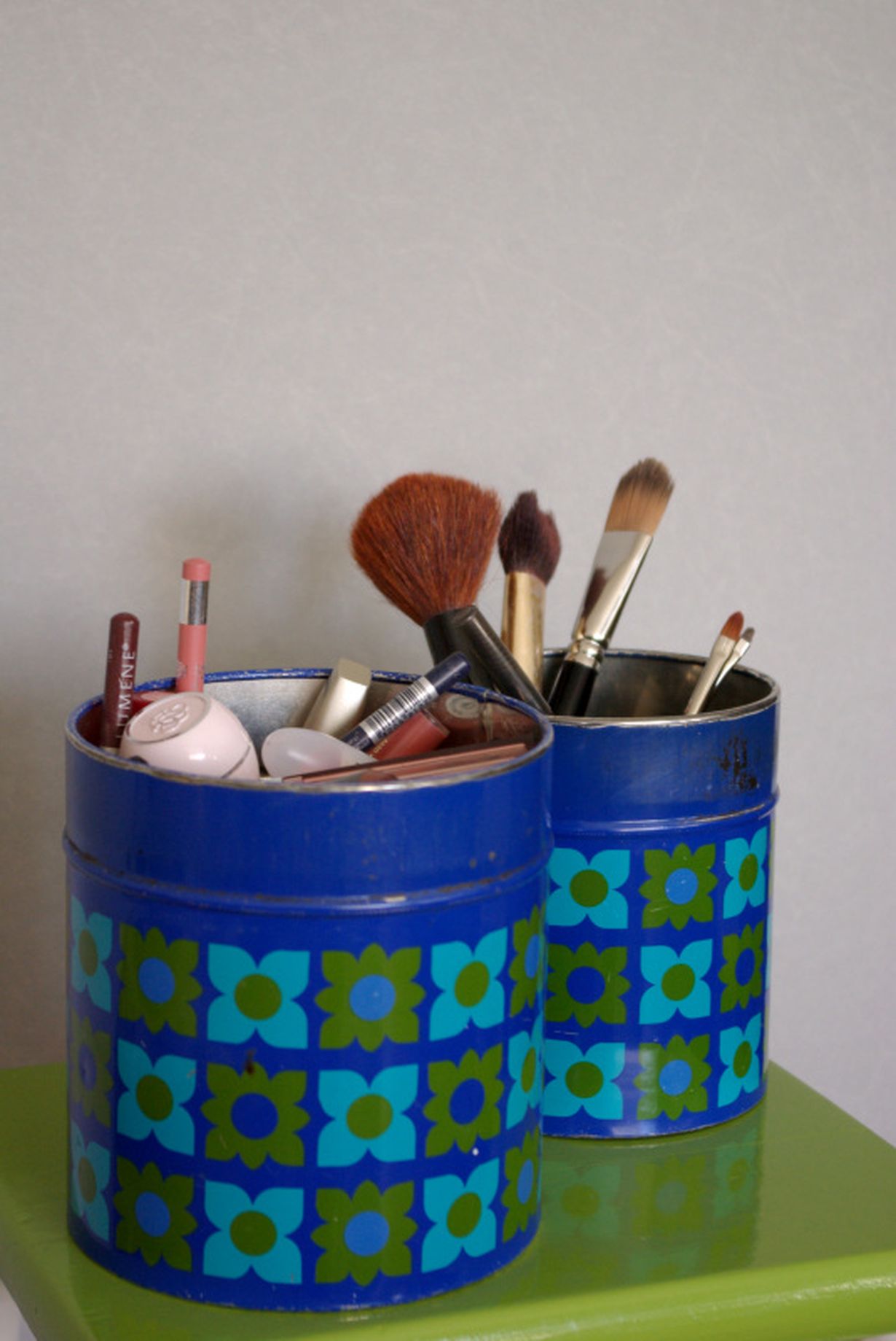 Nämä retrot peltipurkit ovat nähneet paljon elämää ja tällä hetkellä ne palvelevat kylpyhuoneen avohyllyllä "meikkipussinani". Kylpyhuoneessamme ei ole ovellisia säilytysmahdollisuuksia, joten esteettisyys ennen kaikkea.