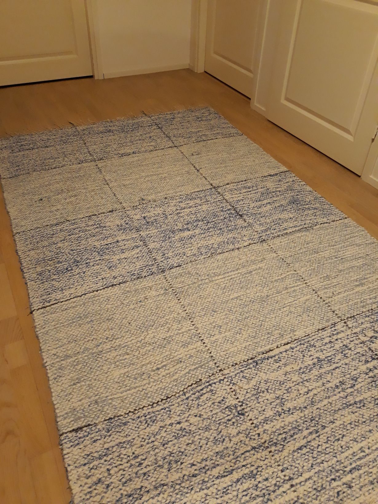 Olen saanut tämän maton lapsuudenkodistani muuttaessani oman perheen kanssa vastavalmistuneeseen uuteen kotiin. Matto palveli ensin keittiössä ja nyt se pn siirretty eteiseen.