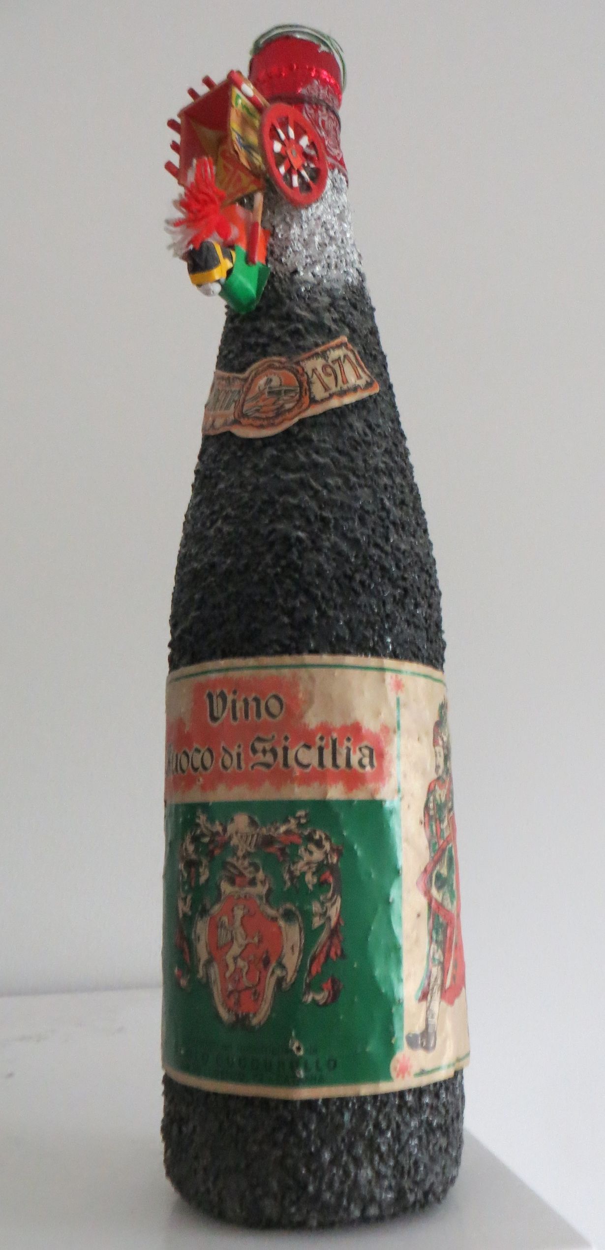 Sain tämän viinipullon mummini tuliaisena Sisiliasta 1970-luvulla. Se on kuorrutettu juuri nytkin aktiivisena möyryävän Etnan laavalla. Makua en enää muista, mutta taisi olla sisus yhtä hyvää kuin komean musta kuorikin.