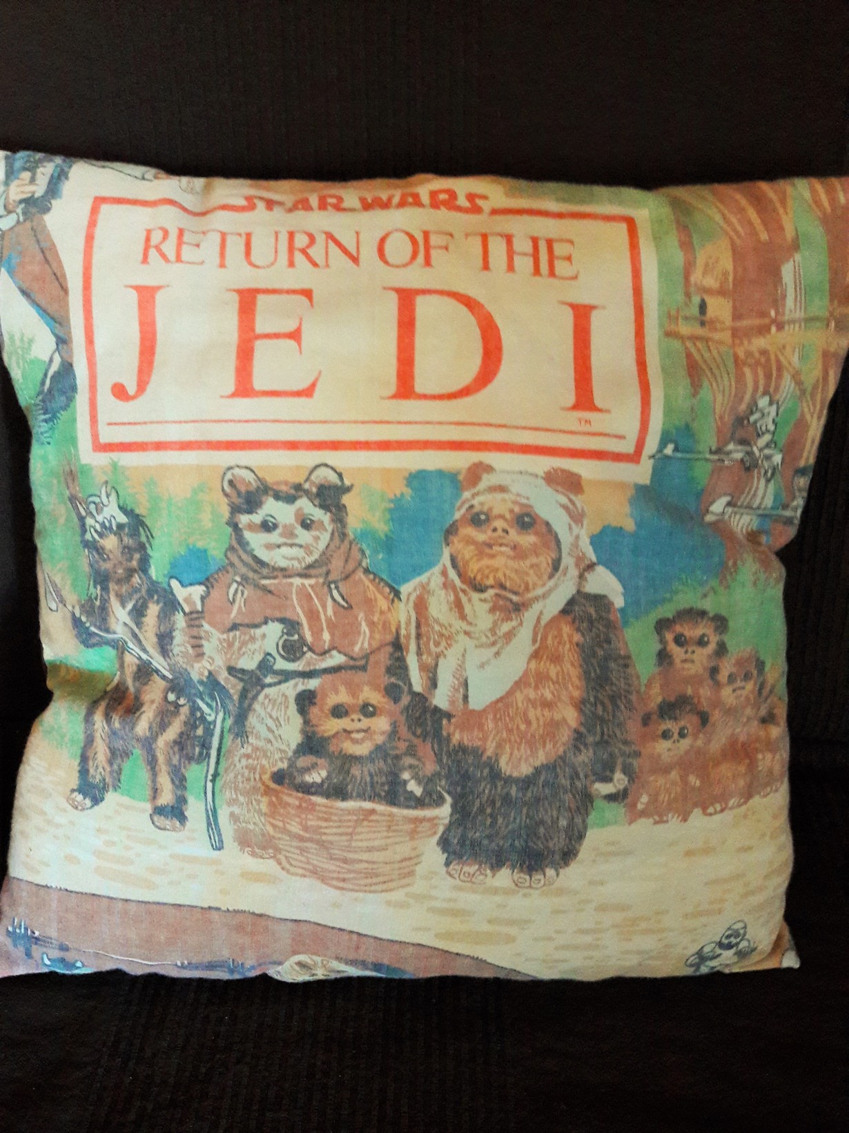 Star Wars-tyyny matkasi täpötäydessä matkalaukussa löhösohvalle Lontoosta. Tyyny ostettiin suoraan sen tekijältä, joka kertoi kankaan olevan uusiokäytössä - liekö ollut edellisessä elämässä lakana? Ewokit ovatkin miellyttävän pehmeitä poskea vasten päiväunilla!