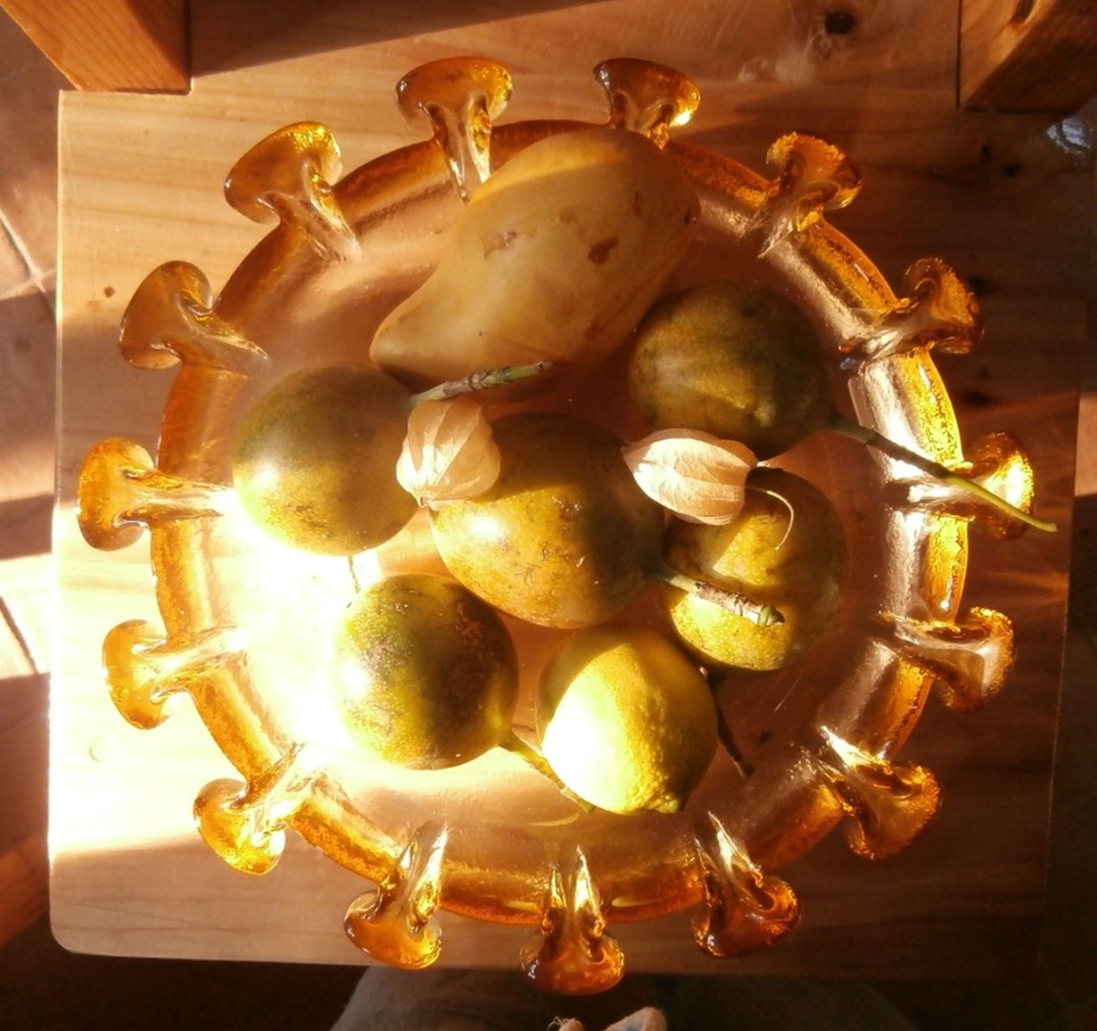 Perin Fafalta hänen eläkelahjaksi saadun lasikulhon. Pohjalla näkyy Vantaan kaupungin vaakuna. Kulho kyyhötti mitäänsanomattomana Fafan ja Famon eteipöydällä vuosikymmenet, ja vasta Fafan kuoltua huomasin miten vaikuttava esine se on. Raskasta käsinkäsiteltyä lasia, väriltään 60-luvun ruskeanoranssi vaikka Fafa pääsi eläkkeelle kaupungin virastaan vuonna 1982 - olikohan kaupunki hamstrannut niitä varastoon aikaisemmin? - Itse hedelmävalikoima näyttää tässä vaatimattomammalta. Asumme Meksikossa ja kulhossa on grenadilla-passionhedelmiä, sitruuna, mango, pari naapureiden "physalista" ja iltapäivä-aurinkoa.
