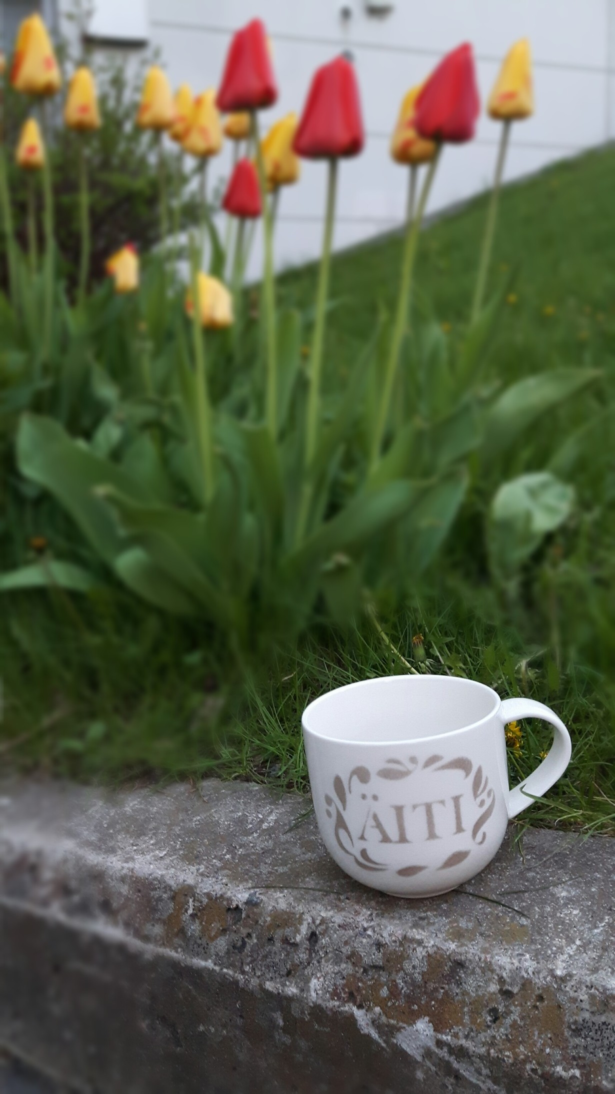 Tässä on kuva äitienpäivänä lahjaksi saadusta mukista. Tämä on lempi kahvikuppini. Sen lisäksi että se on kaunis esine sillä on tunnearvoa. Mikäs hienompaa kuin kuin ihana perhe, lämmin kesä ja hyvä kahvi. ❤☕?