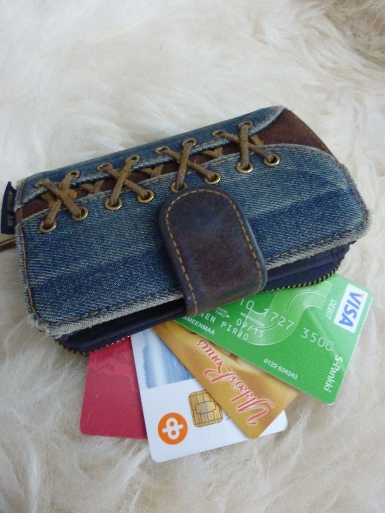 Löysin tämän ihanuuden kirpputorilta viime talvena. Siinä on miljoona lokeroa korteille ja muulle tärkeälle, kaksi vetoketjullista paikkaa kolikoille ja tilava lokero seteleille. Se on oikea tilaihme, mutta parasta siinä on ehdoton tyyli!