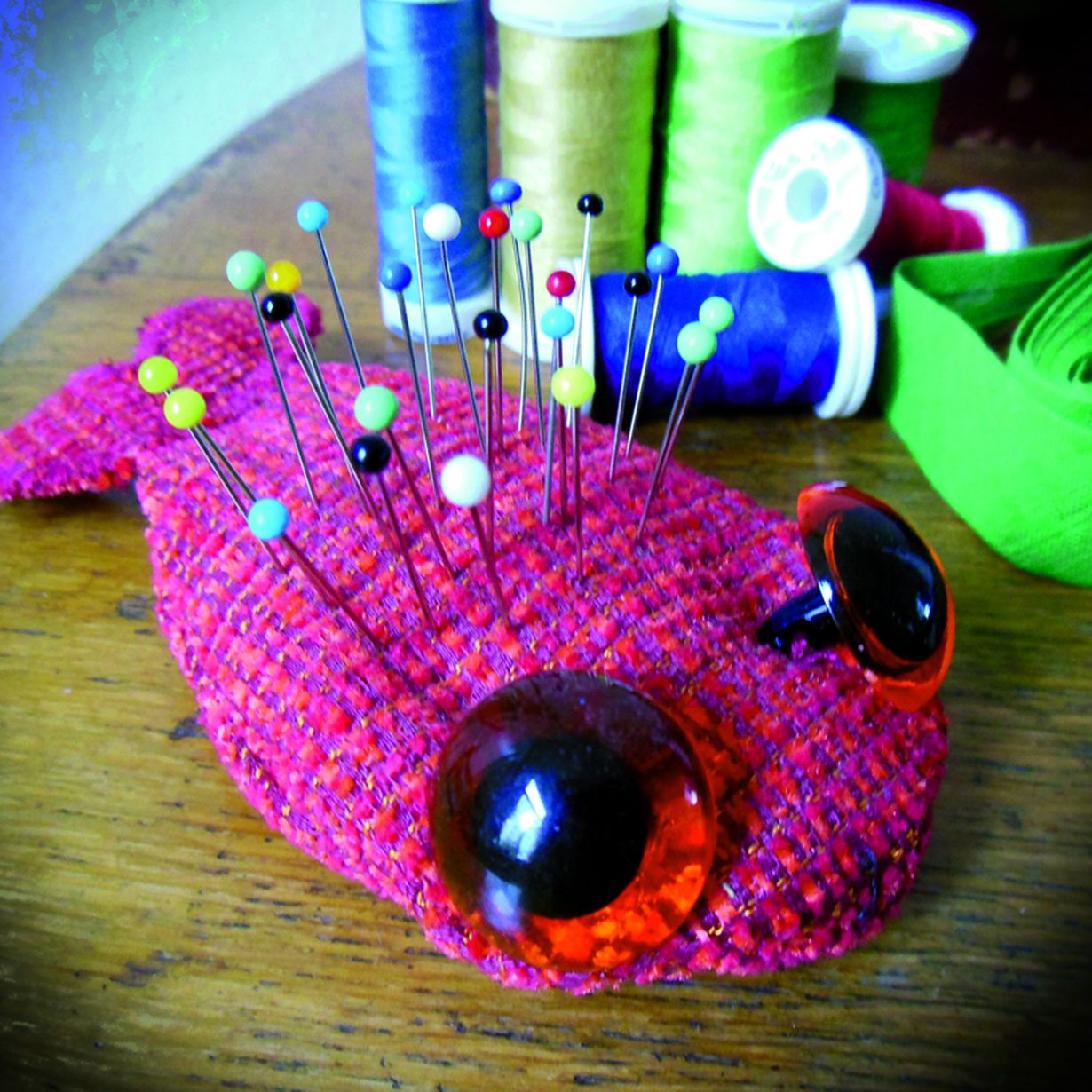 Itse huonekalukankaiden esittelytilkuista ja second hand -kaupasta löytyneistä lasinapeista tehty mulkosilmäinen fisuneulatyyny piristää ompelupäivää.