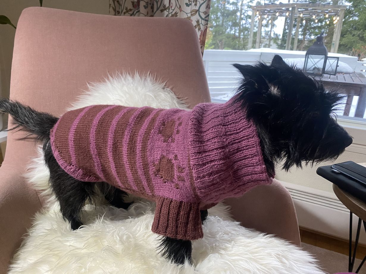Poistuvasta väristä tein tyttärelle kynsikkäät, lopusta piti tulla vielä myssy, mutta lanka loppui kesken, ja niinpä Frida sai itse suunnitellun alpakkajumpperin, elämäni ensimmäiset kuviot vähän kiristää.
