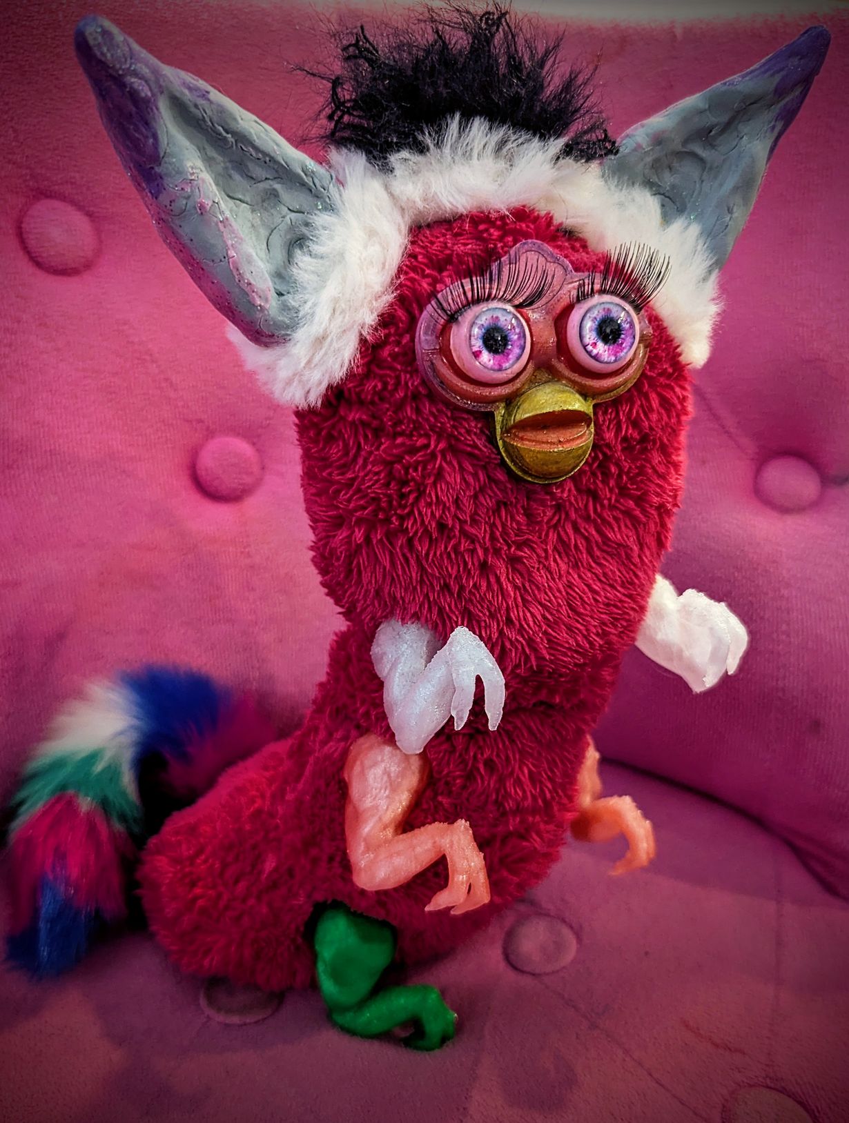 Tehty lahjaksi tytöilleni, joista toinen fanittaa kovasti 2000-lukua. Vartalo ommeltu ja täytetty hernepusseilla, korvat muotoiltu silkkisavesta, jalat 3d-tulostimella tulostettu, samoin naamalevy. Lopuksi maalattu ja lisätty silmät ja ripset sekä pörröinen häntä. Söpö otus saanut kovasti haleja ja ihailua!
