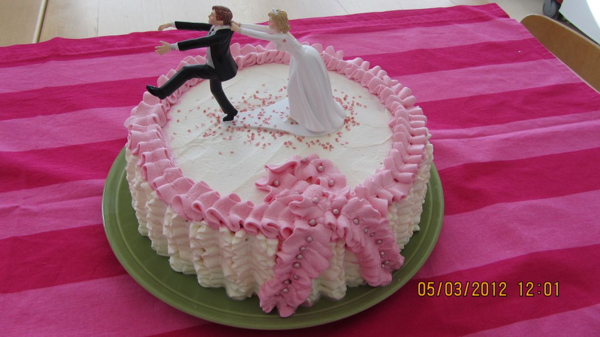 Häittemme kunniaksi leivoin myös työkavereilleni hääkakun. Kakun päälle ripottelin pienen pieniä sydämiä. Täytteenä oli herkullista valkosuklaamoussea ja tummasuklaamoussea johon oli sekoitettu mariannecrushia!