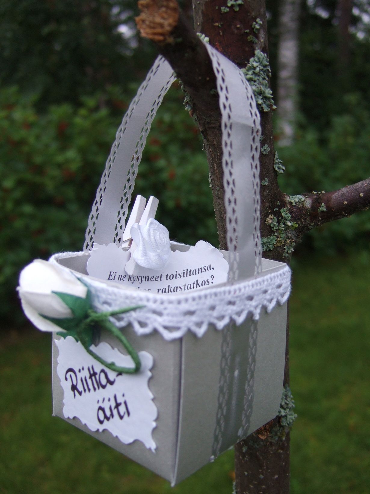 Poikani häissä oli tällaiset kartongista askarrellut pienet korit nimilappuina pöydissä ja näihin sai hakea karkkipuffetista namusia. Sisällä oli myös pieni rakkausruno.