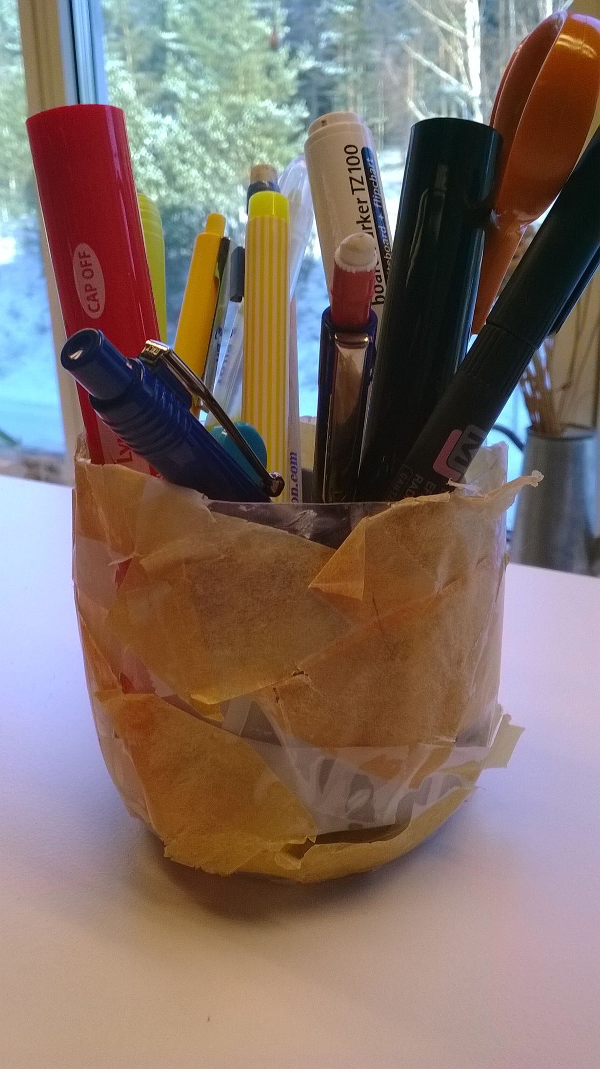 Sain tämän kyntätelineen pojaltani, kun hän oli esikoulussa tai ensimmäisellä luokalla koulussa. Se on ollut siitä asti työpöydälläni ja niin rakas edelleen. Teline on tehty muovipullon pohjasta ja päällystetty silkkipaperin paloilla. Nyt poika on jo 18 v. Aika kuluu ja silkkipaperin värit haalistuvat, äidin rakkaus ei koskaan.
