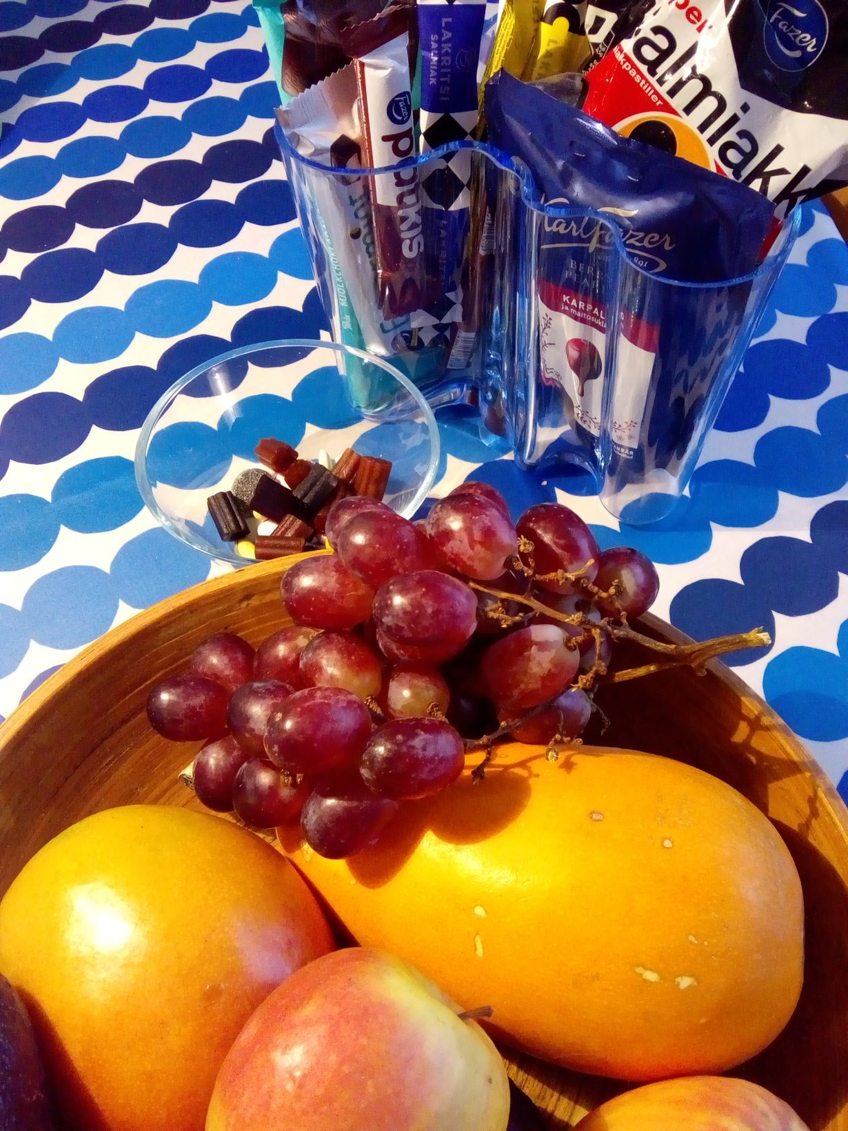 Vaikka hedelmiä on aina tarjolla, tavallisin jälkiruokamme ovat erilaiset suklaat. Mies ja tytär tykkäävät (Fazerin) kermaisesta maitosuklaasta, itse suosin laktoositonta tummaa suklaata - ja lakritsaa!