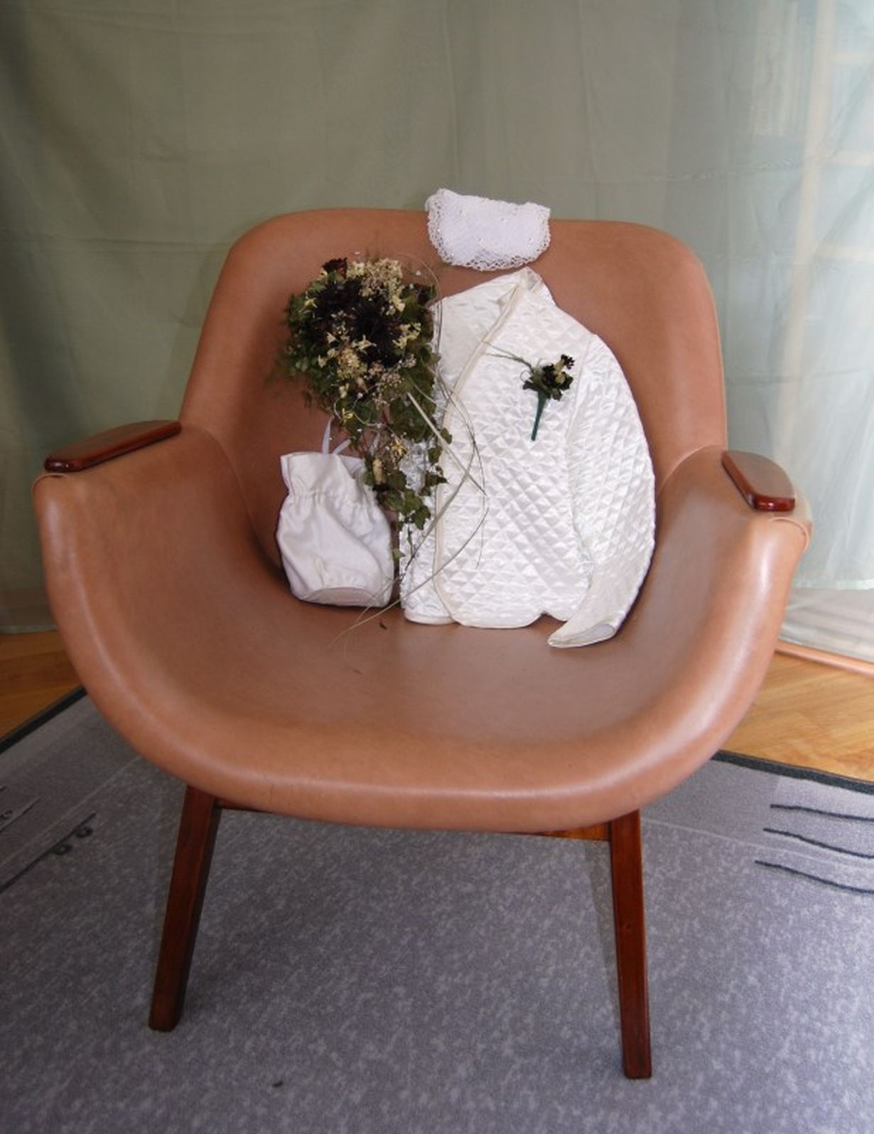 Tuolin selkänojalla on ensimmäisen morsiamen helmikoristeinen hiusverkko ja valkoinen morsiamen äidin tekemä pussukka. Toisen morsiamen morsiustytön pikkutakki on myös äidin ompelema. Morsiuskimppu ja sulhasen rintakukka ovat myös vuosikymmenten takaa.