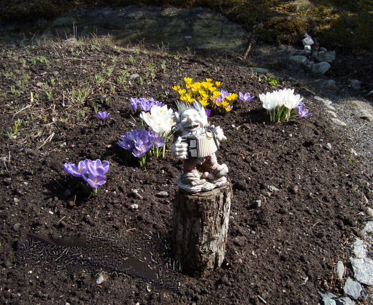 Kukkapenkin vartijapeikko soittaa kukille reipasta kasvumusiikkia haitarilla. Peikko on musisoinut ja vartioinut kukkapenkkiäni monet vuodet: Keväästä alkaen uuteen kevääseen asti - talvellakin.