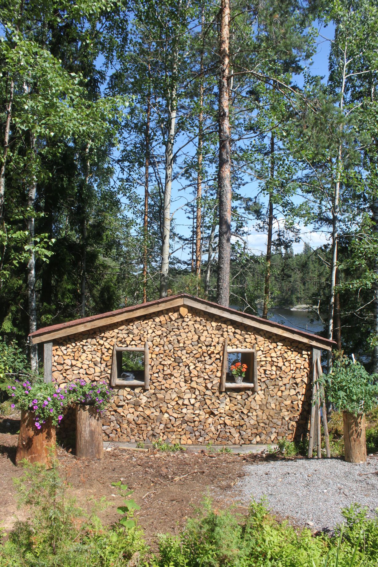 Halkotalo rakentui Sudensalmen mökille Lappeenrantaan. Tarkoitus oli tehdä näköestettä naapuriin ja antaa heille uimarauhaa. Pienet kurkistusikkunat uteliaita varten kuitenkin tehtiin :)