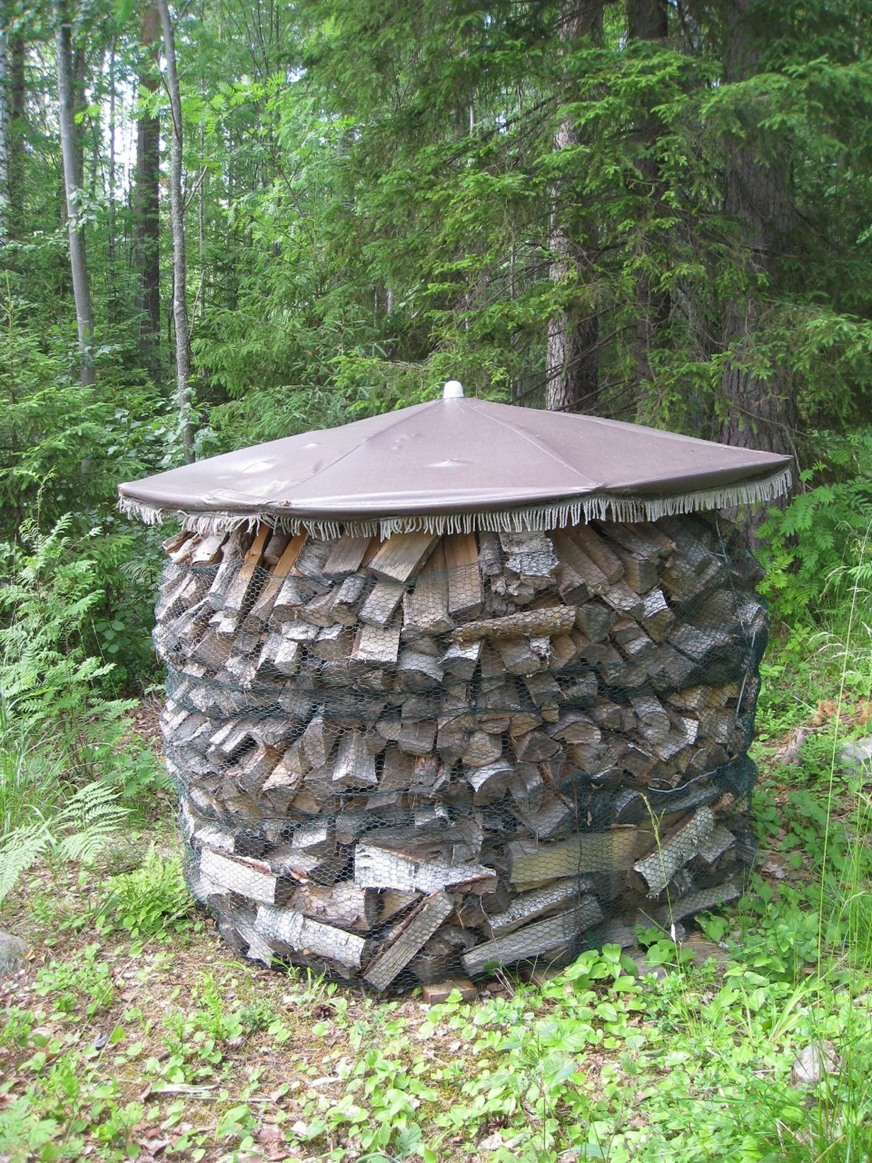 Tämä ihana arki: halkopino Halkotorni 29.6.2013 klo 16:45 Tavanomaisen pinon ladonta kyllästytti. Päätettiin rakentaa klapeista pyöreä torni vanhan päivänvarjon alle. Ursula