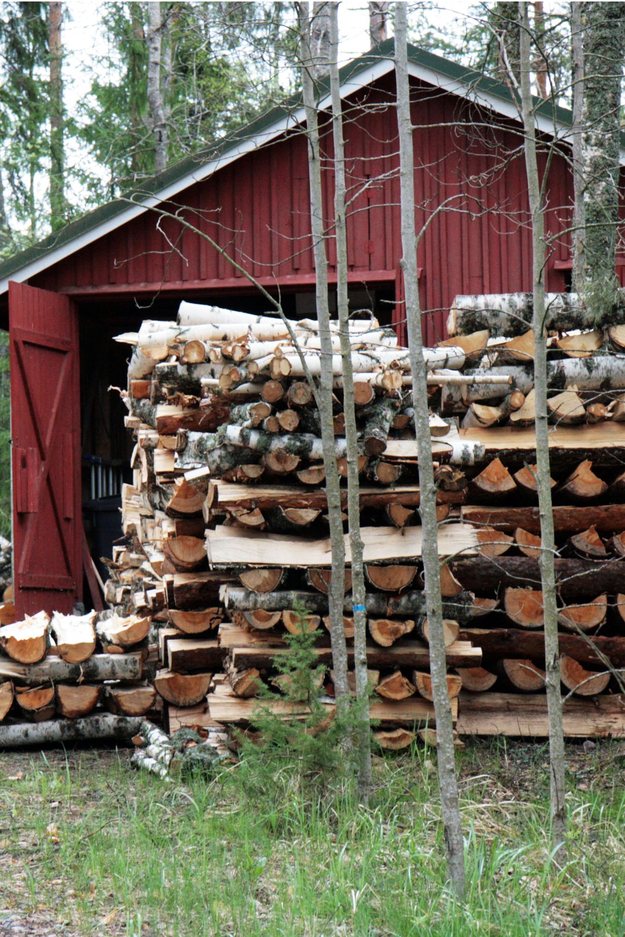 Mökillämme tehtaillaan klapeja talveksi: ensin rungot sahataan metrin mittaisiksi ja halkaistaan. Siinä vaiheessa ne pinotaan kuivumaan. Myöhemmin ne sahataan kolmeen osaan ja hakataan klapeiksi.