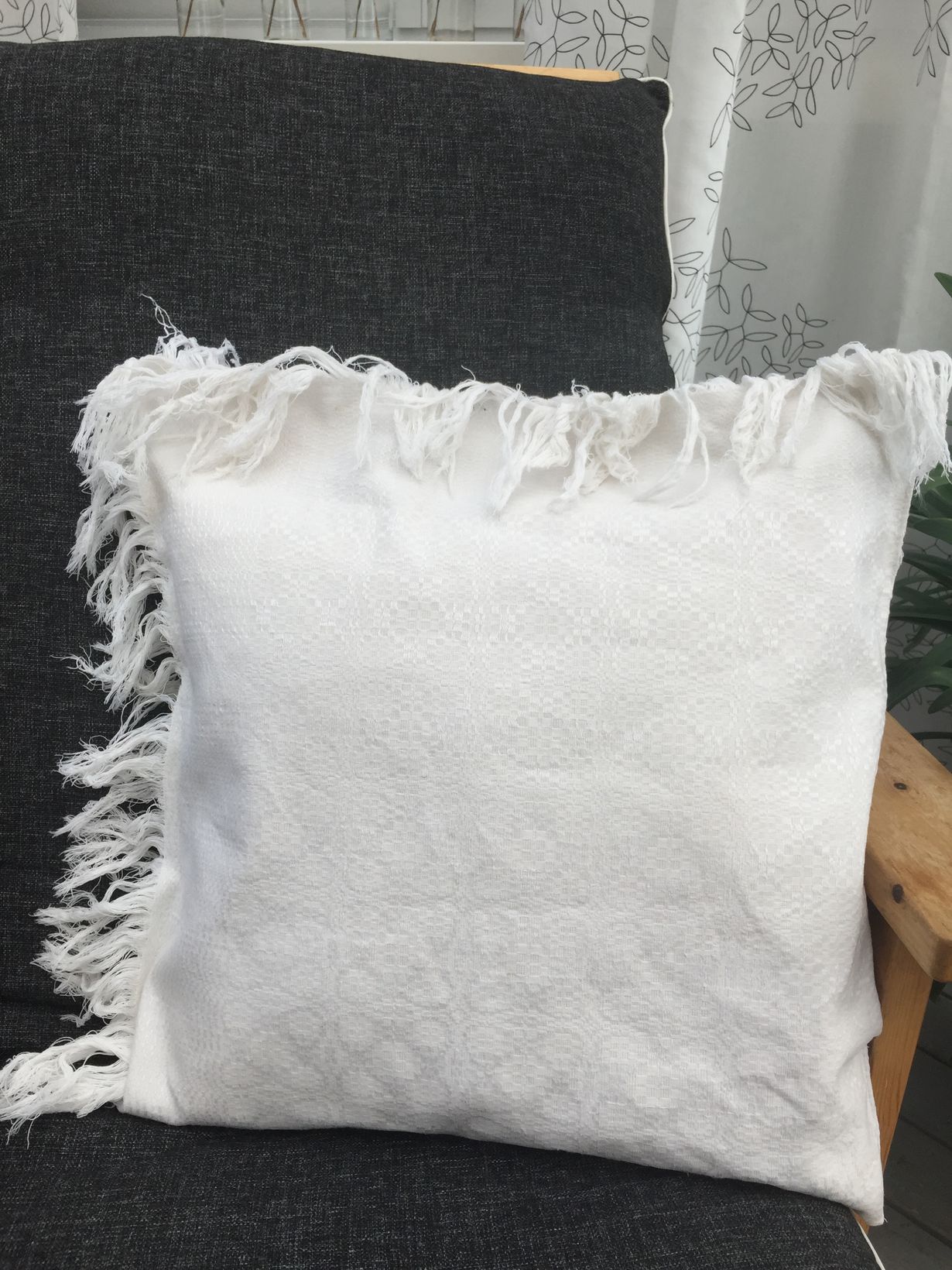Ompelin isoäitini kutomasta pöytäliinakankaasta tyynynpäälliset. Halusin jättää näkyviin pöytäliinan hapsut tyynyihin, ilmettä tuomaan.