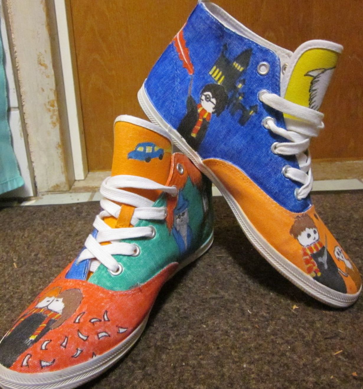 Fanitan Harry Potteria, mutta fanikenkien tilaaminen netistä ei napannut, maksoi liikaa tai printti ei ollut kiva. Niimpä ostin tavalliset 15€ tennarit, ja tuunasin ne Potter kengiksi ! Nyt kengistä löytyy itse Harry potter, Voldemort, Dumbledore, Hagrid ja hänen koiransa tora, Harryn ystävät Ron, Hermione, Luna ja Neville, Voldemortin kuollonsyöjä Belltrix, ja kotitonttu Dobby
