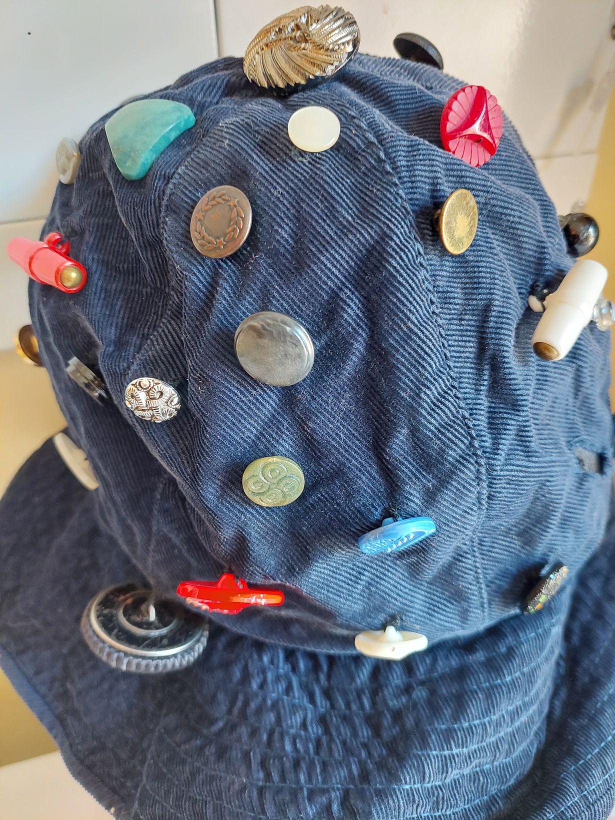 Marttojen tapahtumassa oli hattukilpailu. Oli hauska katsella millaisia koristeluja oli tehty.Voittajalla oli kukkaseppele.Tuunasin vanhan hatun napeilla, oli kierrätystä.