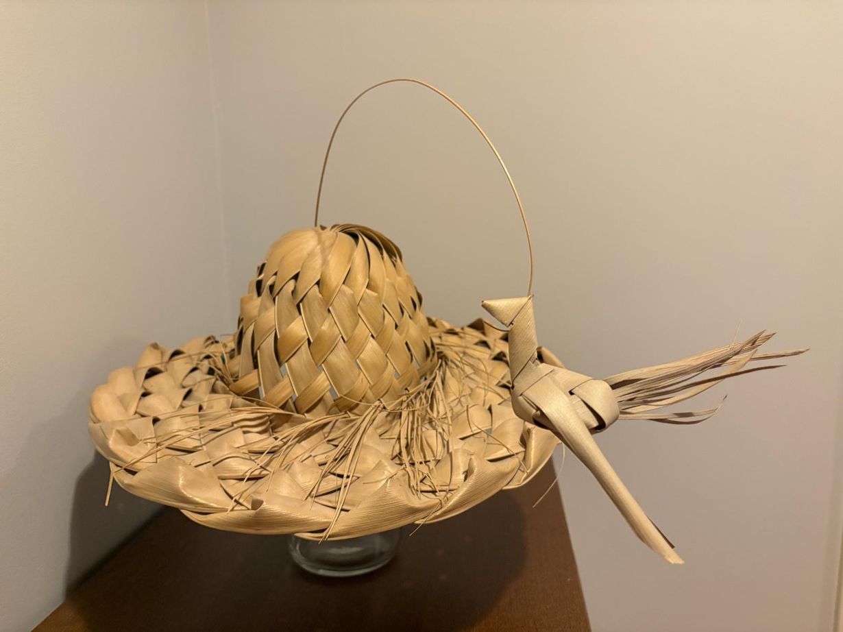 Fidzi-saarella vuonna 1989 tehty "mittojen mukaan" suoraan päähäni palmun lehdestä. Uutena hattu oli tumman vihreä ja todella painava. Lintuja oli kaksi, mutta toinen on vuosien saatossa hävinnyt.