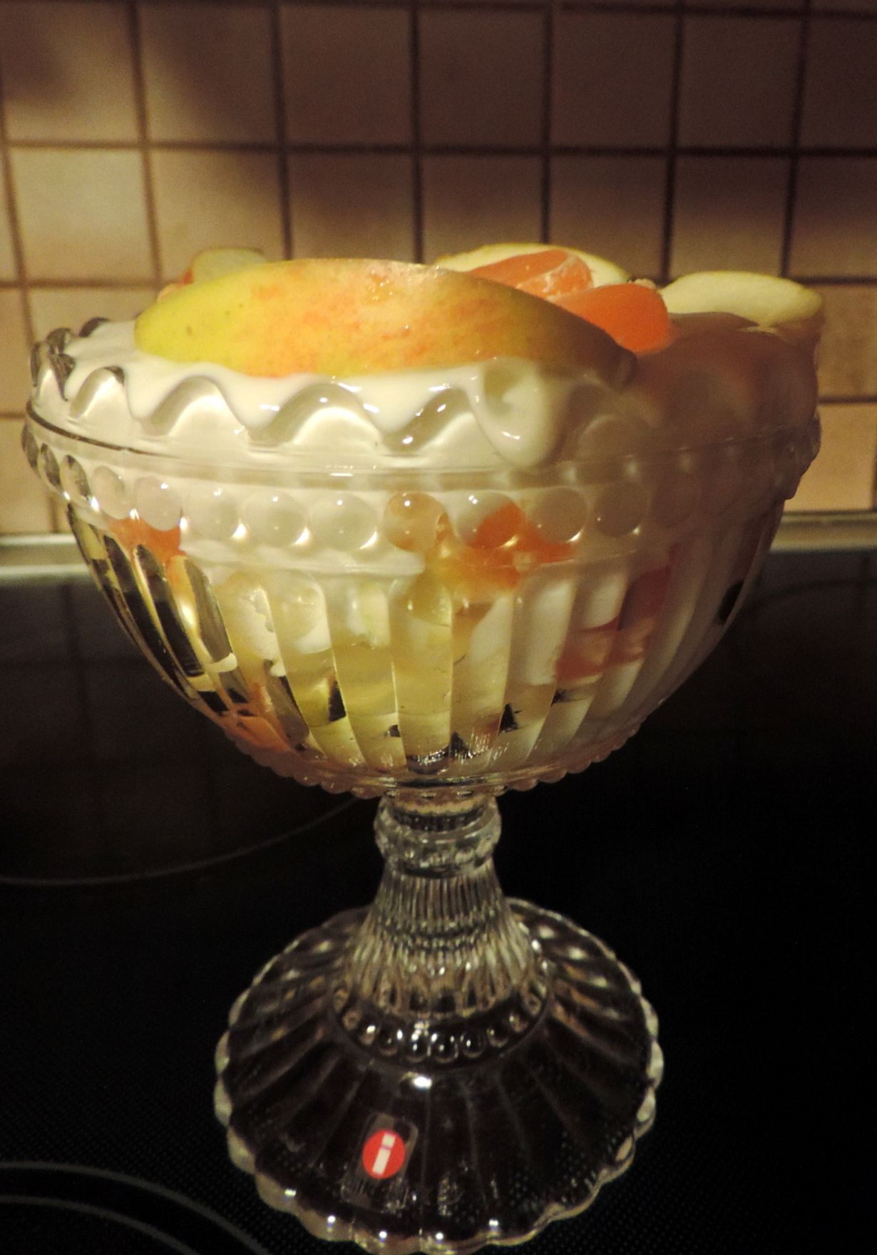 Kotimaista laktoositonta maustamatonta jogurttia, jonka seassa pilkottuja pieniä mandariinin paloja sekä niinikään pilkottuja omenakuutioita.