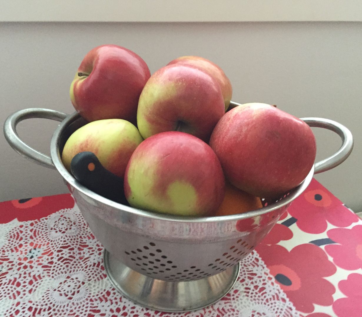 ...siiviläkori siinteli silmissäni useasti - yhtenä päivänä se seisoikin myös minun pöydällä - tänään täynnä ihania omenoita.