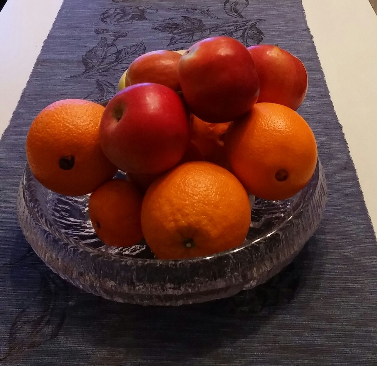 Tämä vanha yli 3 kiloinen lasikulho on peruja äidiltäni. Meillä se toimii hedelmäkulhona ja tuo samalla mieleen lämpimiä muistoja.