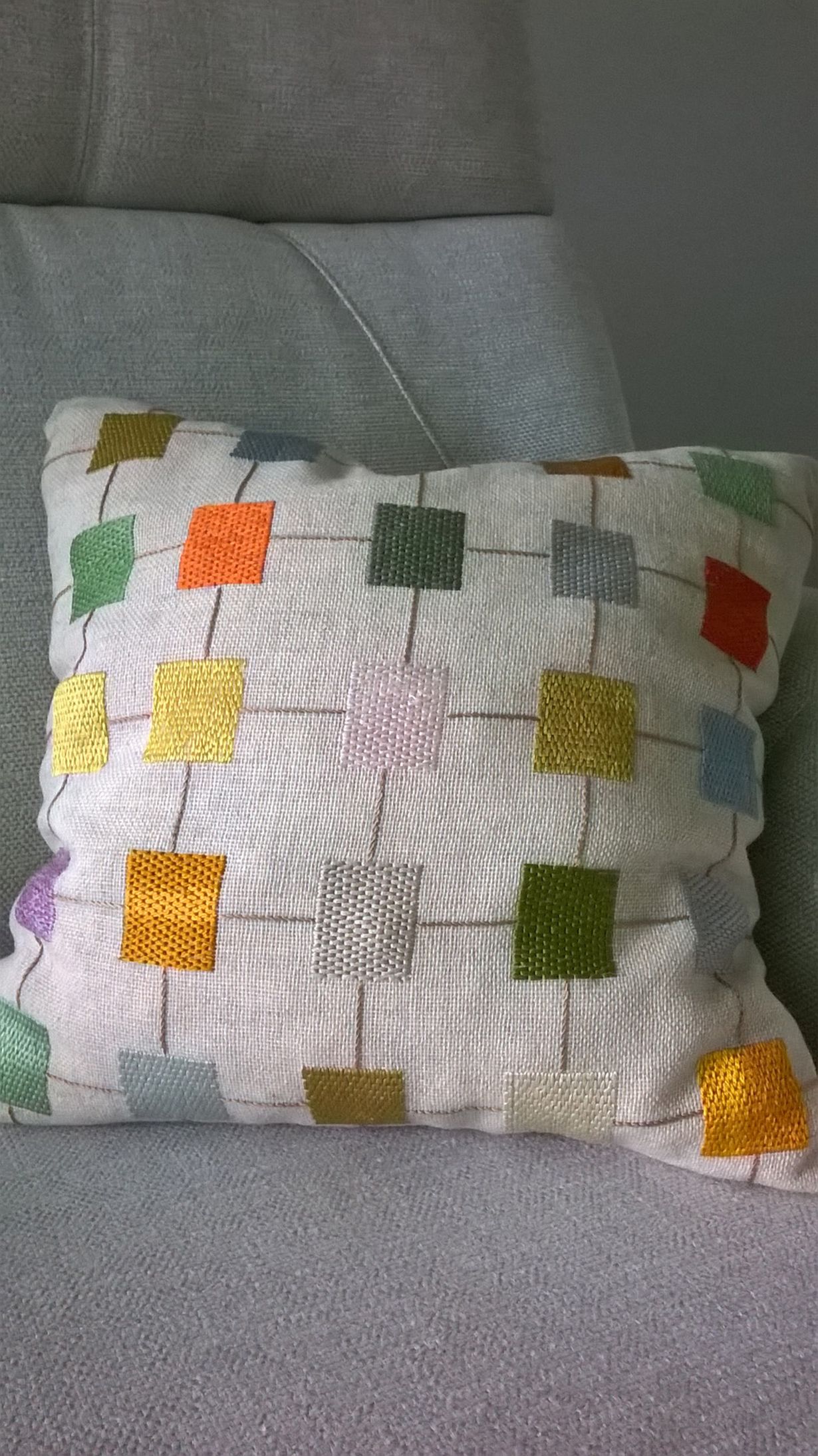 Äitini tekemä tyyny - itseäni vanhempi - on aina vaan yhtä kaunis. Silkkisinä hohtavien lankojen hienot värit olivat mieleeni jo lapsena, eikä maku ole muuttunut.