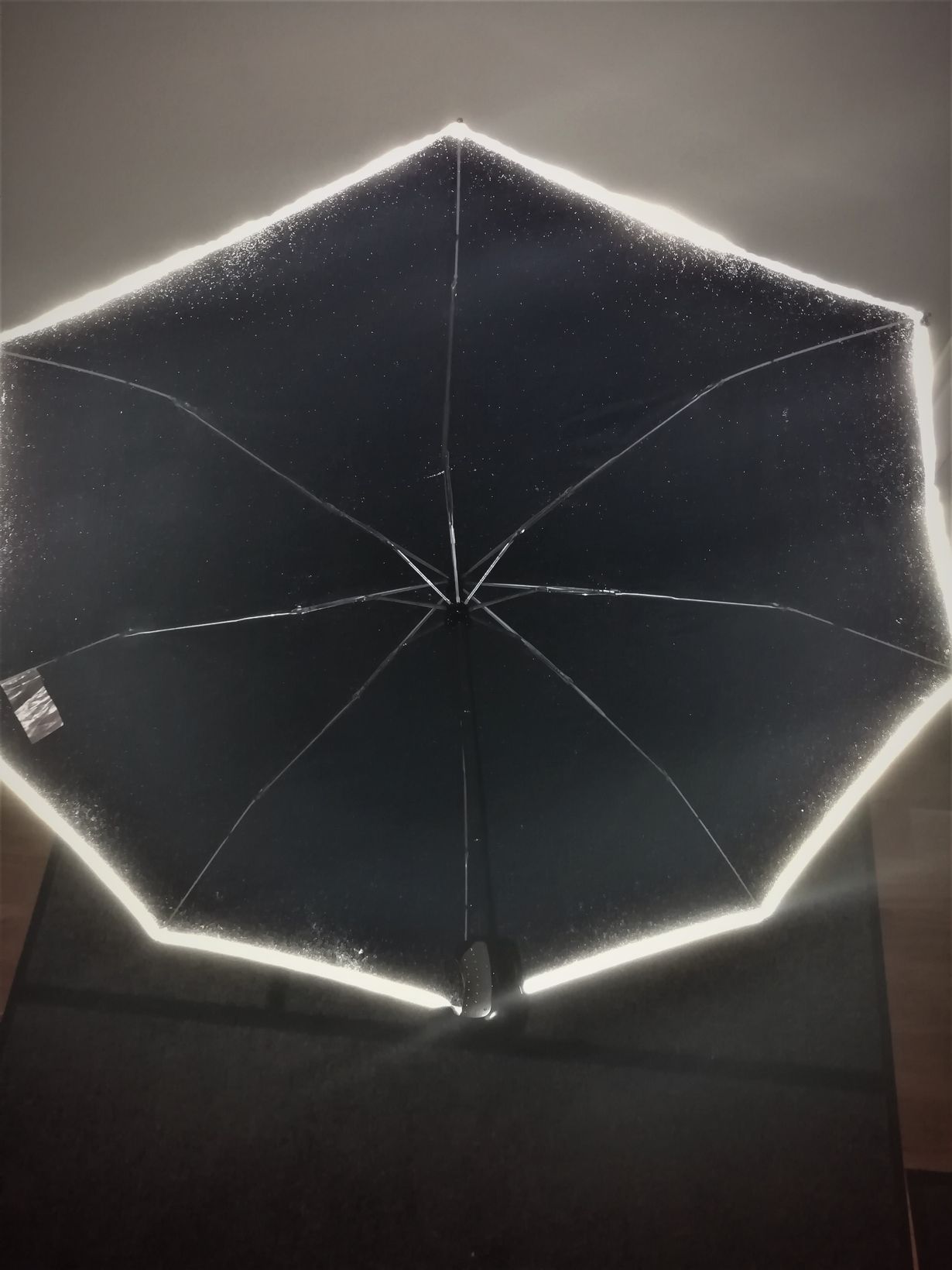 Tämä tummansininen heijastinreunainen sateenvarjo on aikanaan ostettu Lidlistä. Varjo on palvellut perheessämme jo useita vuosia. Varjo taittuu pieneen tilaan sekä avautuu ja sulkeutuu nappia painamalla. Meillä oli myös viininpunainen vastaavanlainen varjo, mutta se hukkui valitettavasti jo muutama vuosi sitten. Ostaisin heti näitä monta lisää, jos niitä taas tulisi Lidliin myyntiin.