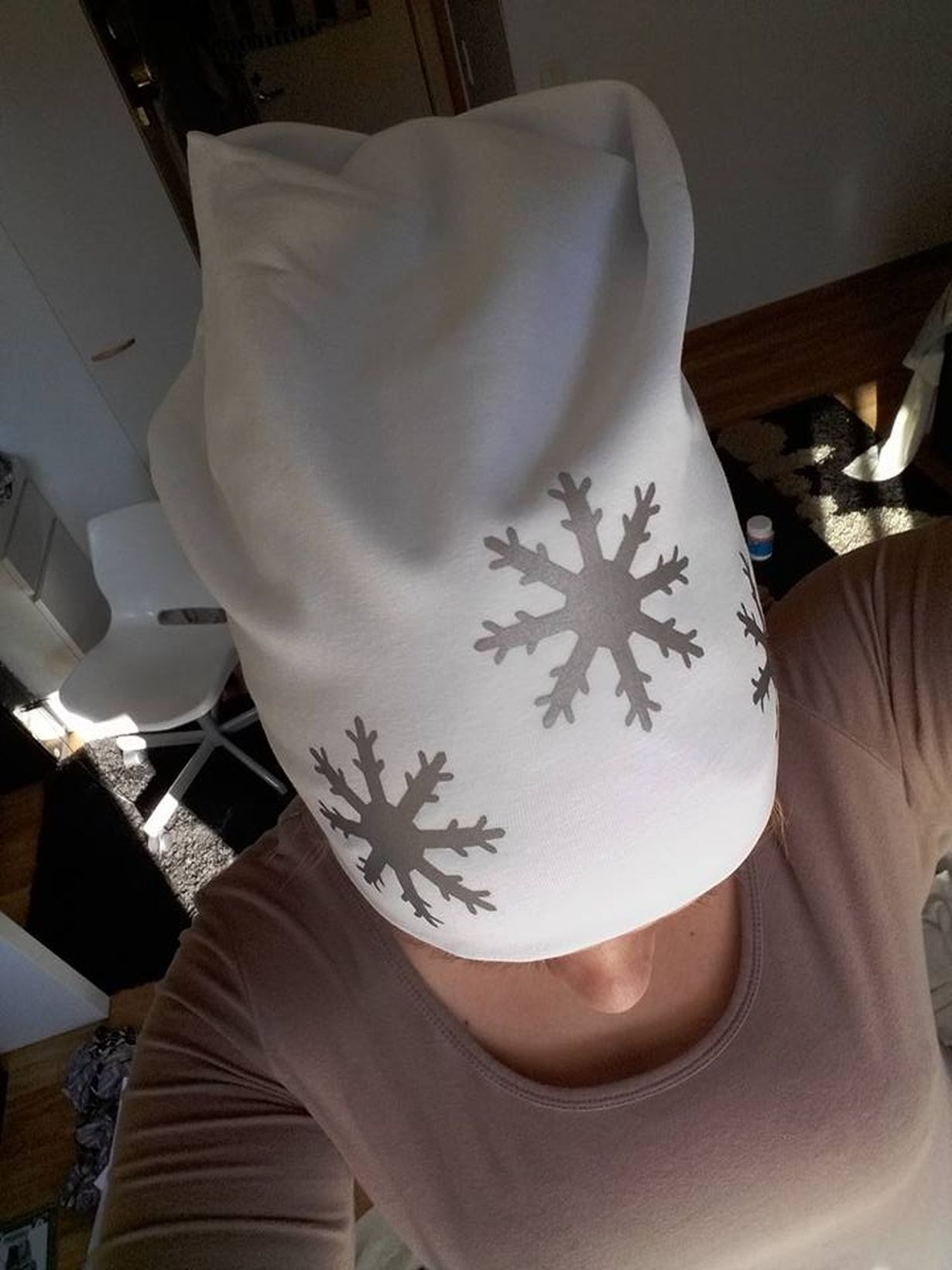 Oma lemppari piponi on löytynyt vasta aikuisiällä, nimittäin valkoinen pipo lumihiutale heijastinpainatuksella.