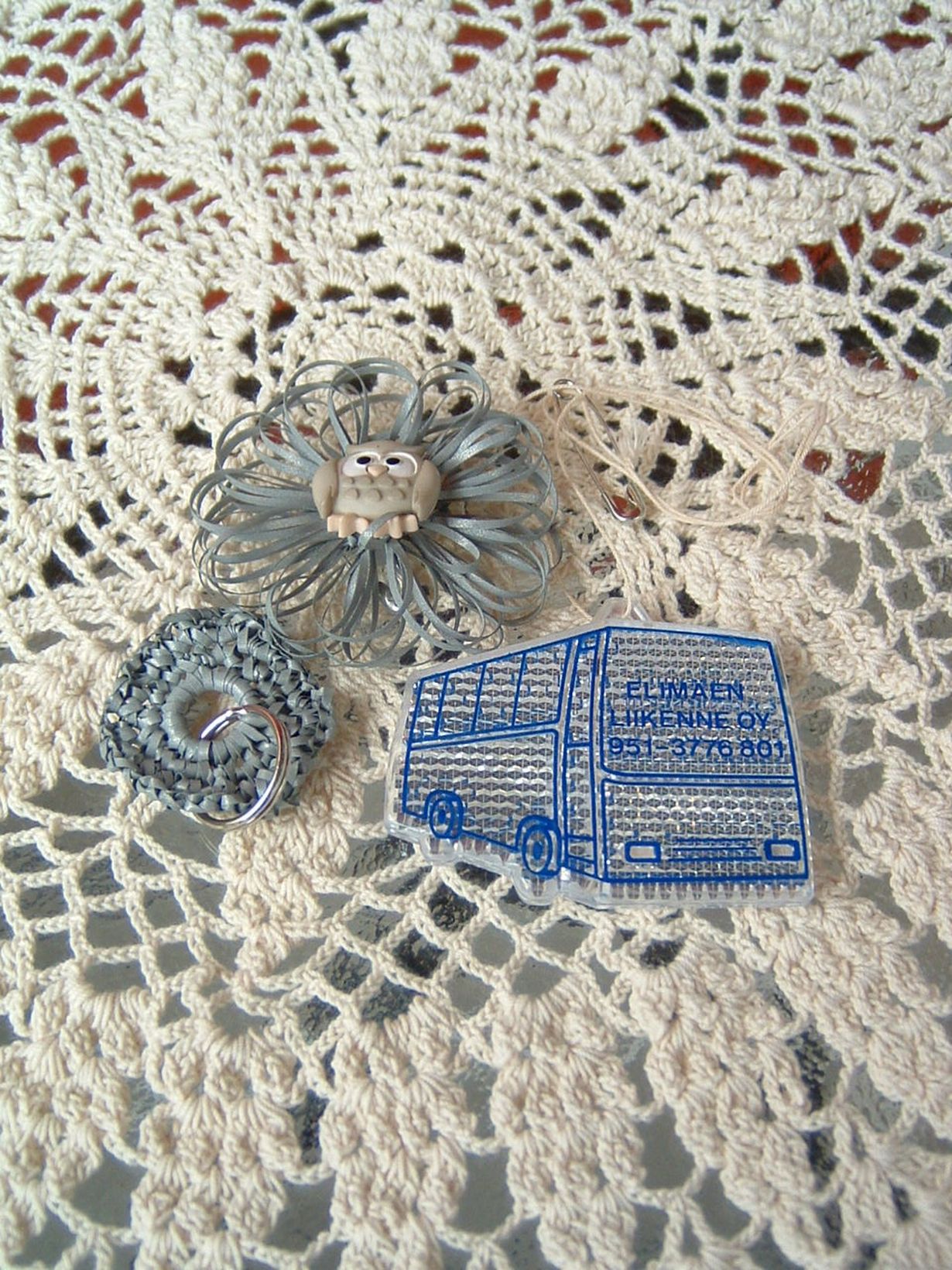 Bussikuskin antama heijastin. Kuvassa on myös itsesuunnittelemiani ja tekemiäni heijastimia. Lanka heijastaa molemmin puolin.