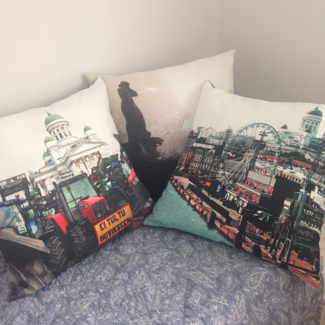 Ihanat, suuret sohvatyynyni ovat Taiga Colorsin suomalaista suunnittelua ja tekoa. Pinta on pehmoinen, ja niitä vasten on niin mukava nojailla ja rentoutua. Koen olevani lahtelainen, mutta synnyin Helsingissä; tämän verran haluan sitäkin muistaa kotonani. Traktorityyny on oikeastaan poikani, mutta minustakin se on huippu. Mielenilmaisua lepopaikalla!